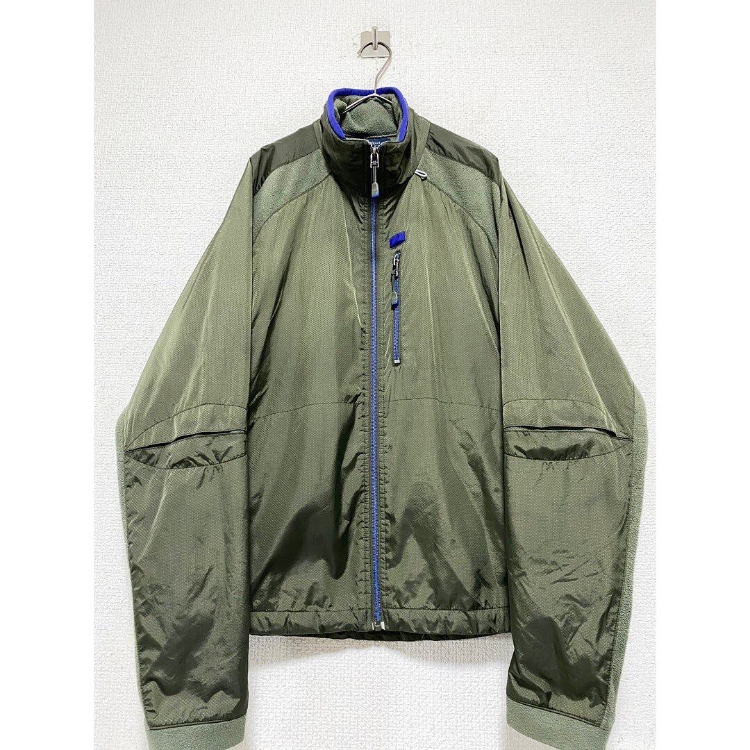 ecwcsなどのフリースを彷彿とさせるミリタリーライクなデザイン セージグリーンフリースととオリーブリップストップナイロンの切り替え 襟周りのパイピング ジップストラップ ジップはラベンダーブルー 狂気的な色使い 首裏にはドローストリングが付いているので、きゅっと閉めて風邪を完全に遮断出来ます 裾も同様 円形に切り替わったアームはスリット入り