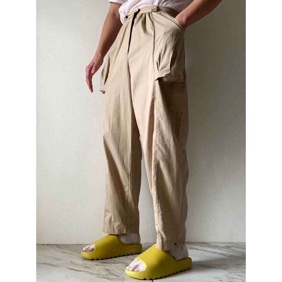 マチ付き、タック入りサイドポケット センターシームが入ることによって、ゆるっとしすぎないシルエットに 仕上げにテーパード