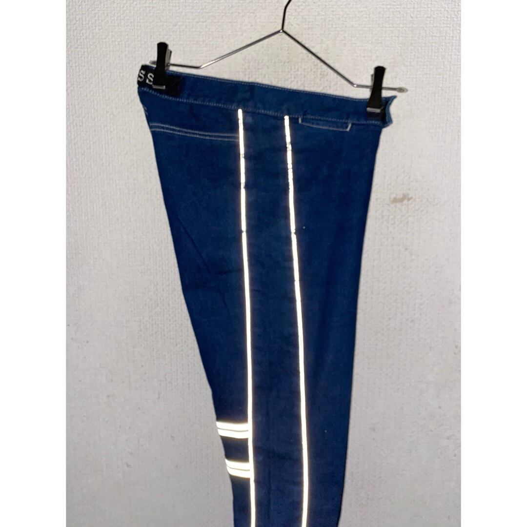 濃紺の伸縮性のあるストレッチデニム地 サイドリフレクターライン 膝上にもリフレクターライン バックのゲスストラップもボトムスインした時良い感じに主張されます