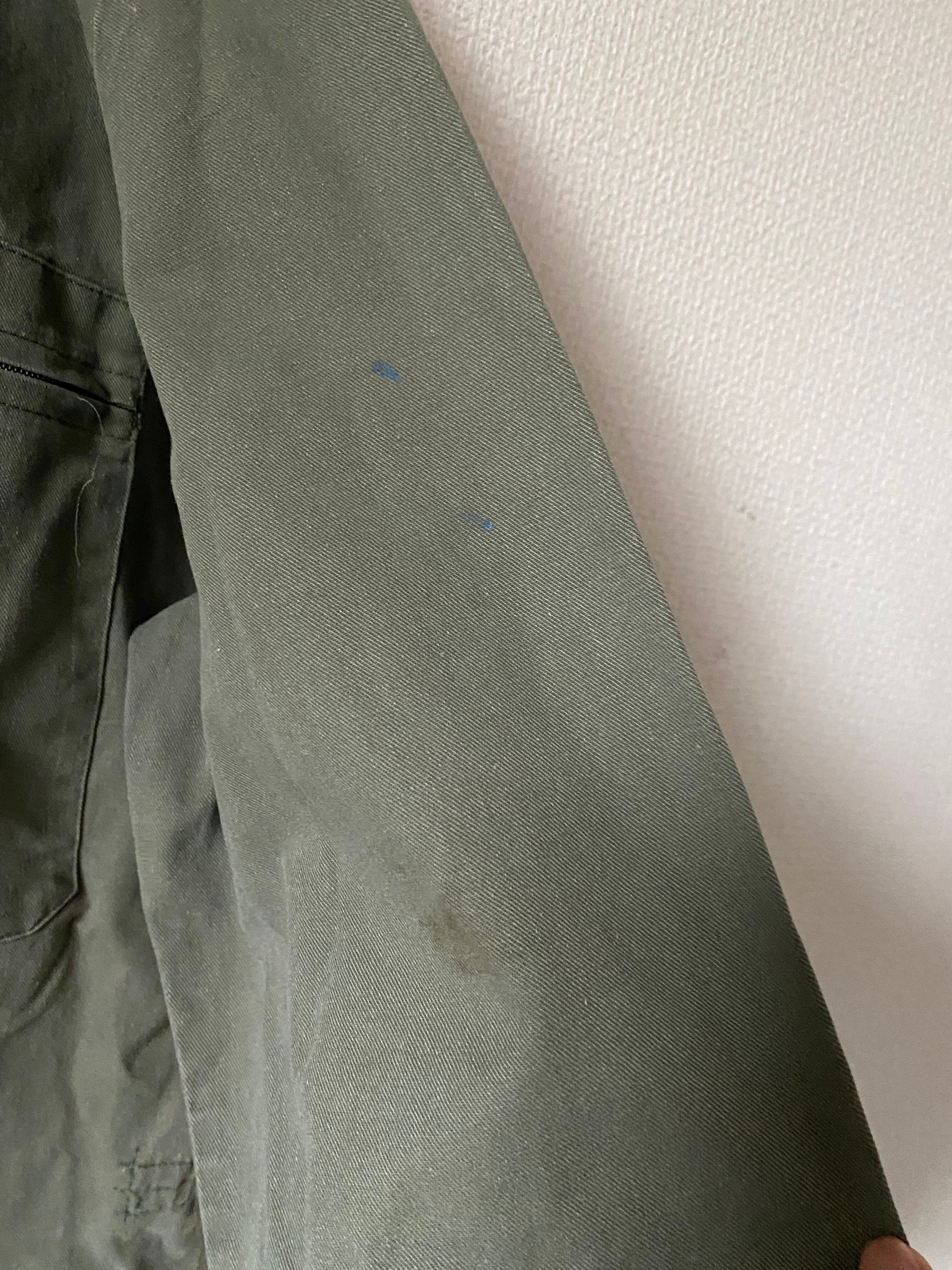 フランス軍の乗り物や機械などの点検・整備を行なっていた整備士のユニフォーム 頑丈で厚手のオリーブコットン 胸ポケット、前ポケット、サイドスルーポケット 裾はベルクロ付き 靴下で遊べます