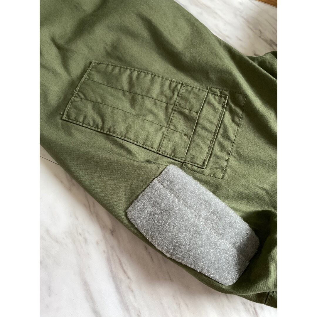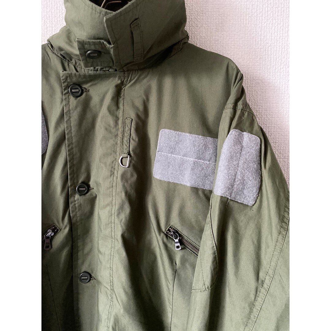 所々にベルクロ アーム部分にペンポケット フロントにはDカン ジップとボタンの仕様 チンストラップ付きの襟を立てて着れるつくり 収納フード