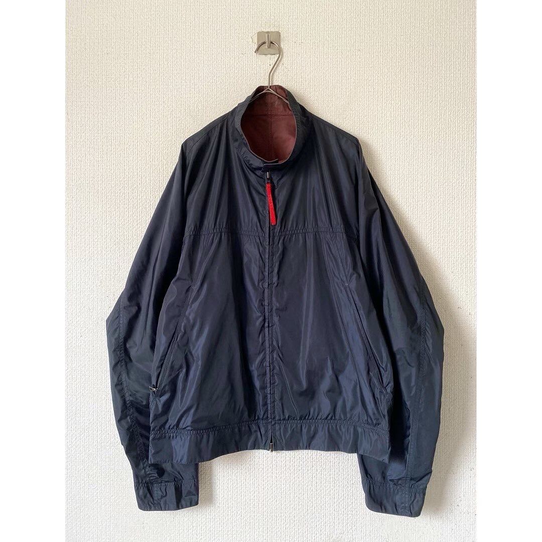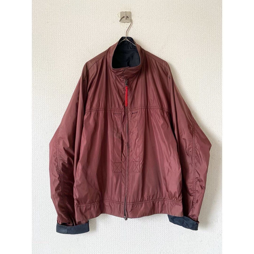 A面はダークネイビー 再度ジップポケット 脇には通気口 B面はバーガンディー 前立横にジップポケット 二つで作りが違うところが良いですね 襟、袖口を折り返すとバイカラーになります プラダ特有の滑らかな高密度ナイロン お馴染みのロゴジップストラップも良し