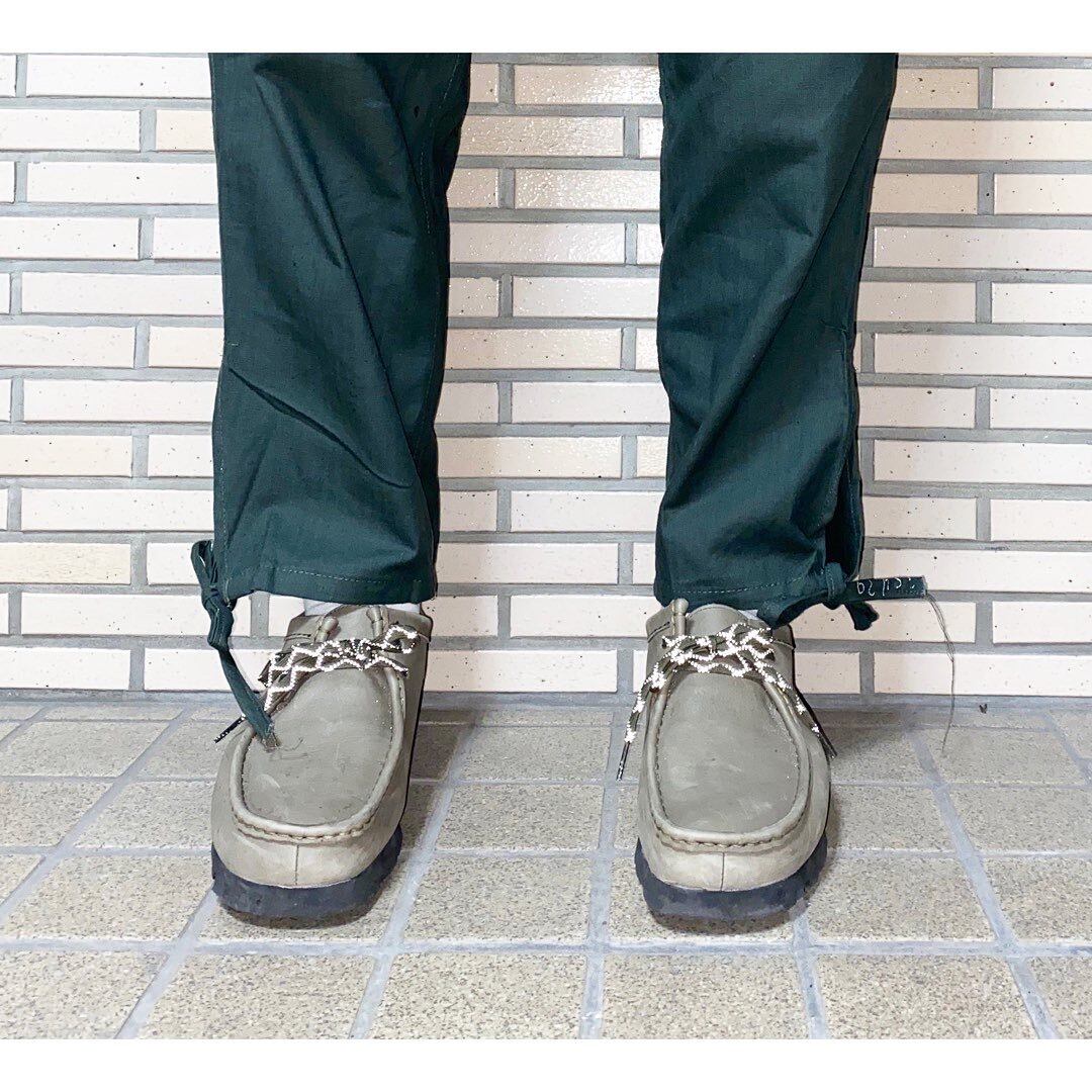 ダークグリーンの肉厚ヘリンボーンツイルコットン 裾にはステンシル入りの紐付き 自由自在に履き方を変えられます ウエストは楽なイージー仕様 太くも細くもない絶妙なサイズ感