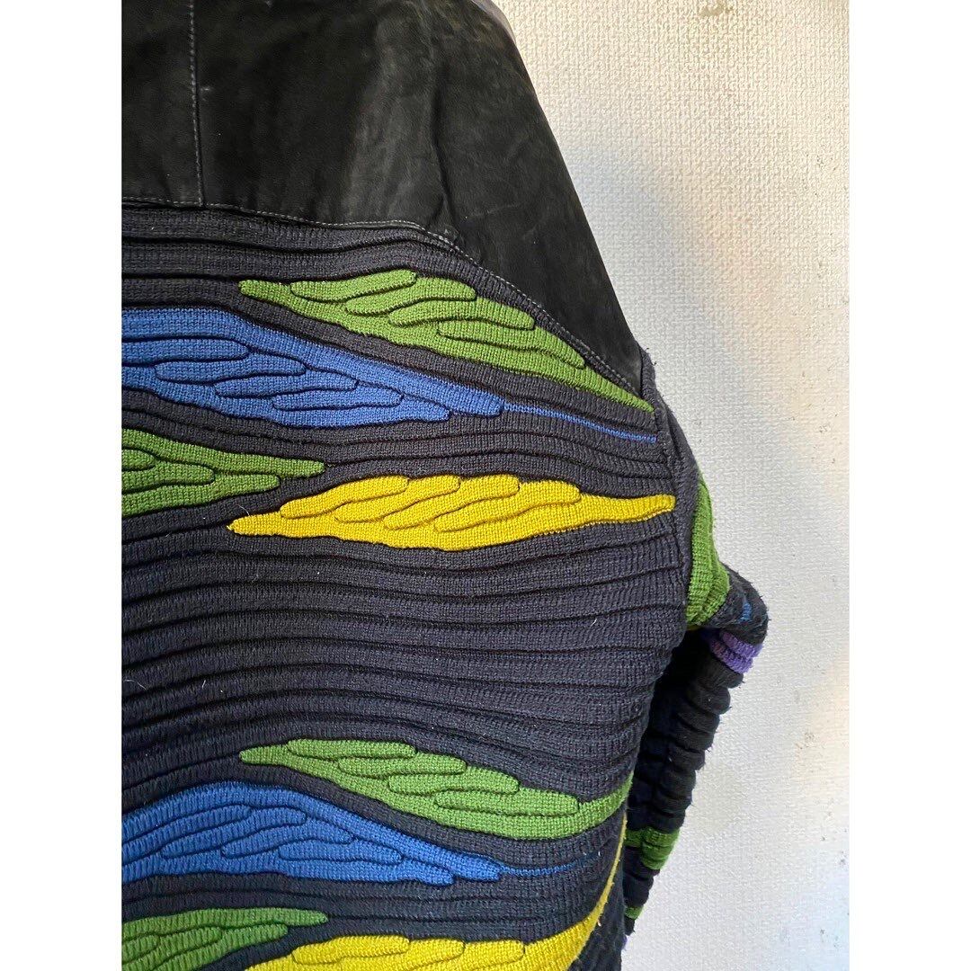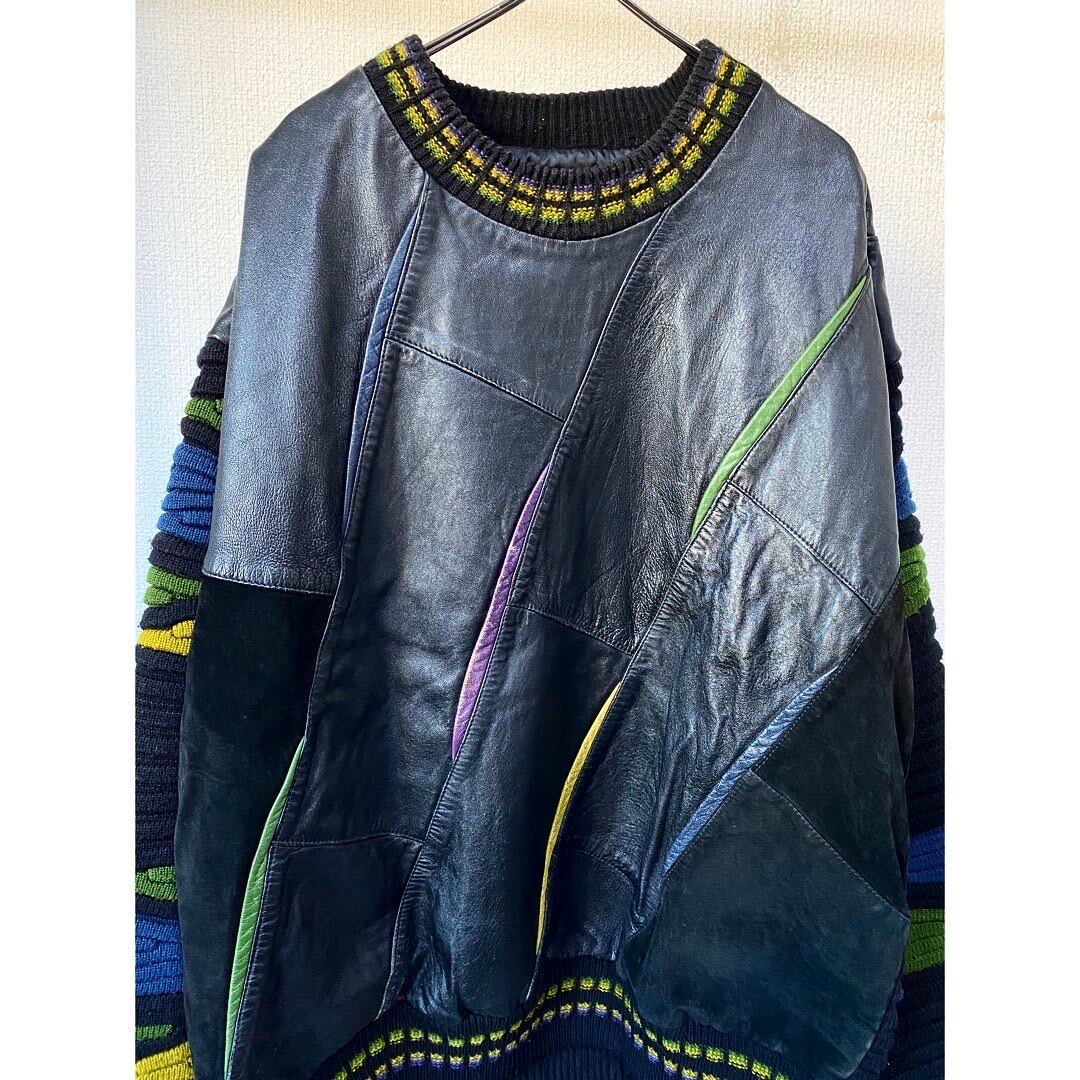 前身頃はパッチワークレザー 所々ネイビー、グリーン、パープル 、イエローのレザーがピロっと出ている気の利いたデザイン バック上部、前身頃サイドはスウェードレザーへの切り替え アーム部分は凸凹とした立体的な作りのアクリルニッティング ネック、リブ周りの切り替えも良し
