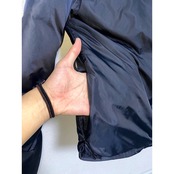 A面はダウンとしては珍しいステッチ無しのツルッとした仕上がり B面はバイアス状に入ったステッチ いずれもポケット付き 主張弱目のロゴも良し ネイビーブラックの良い色味