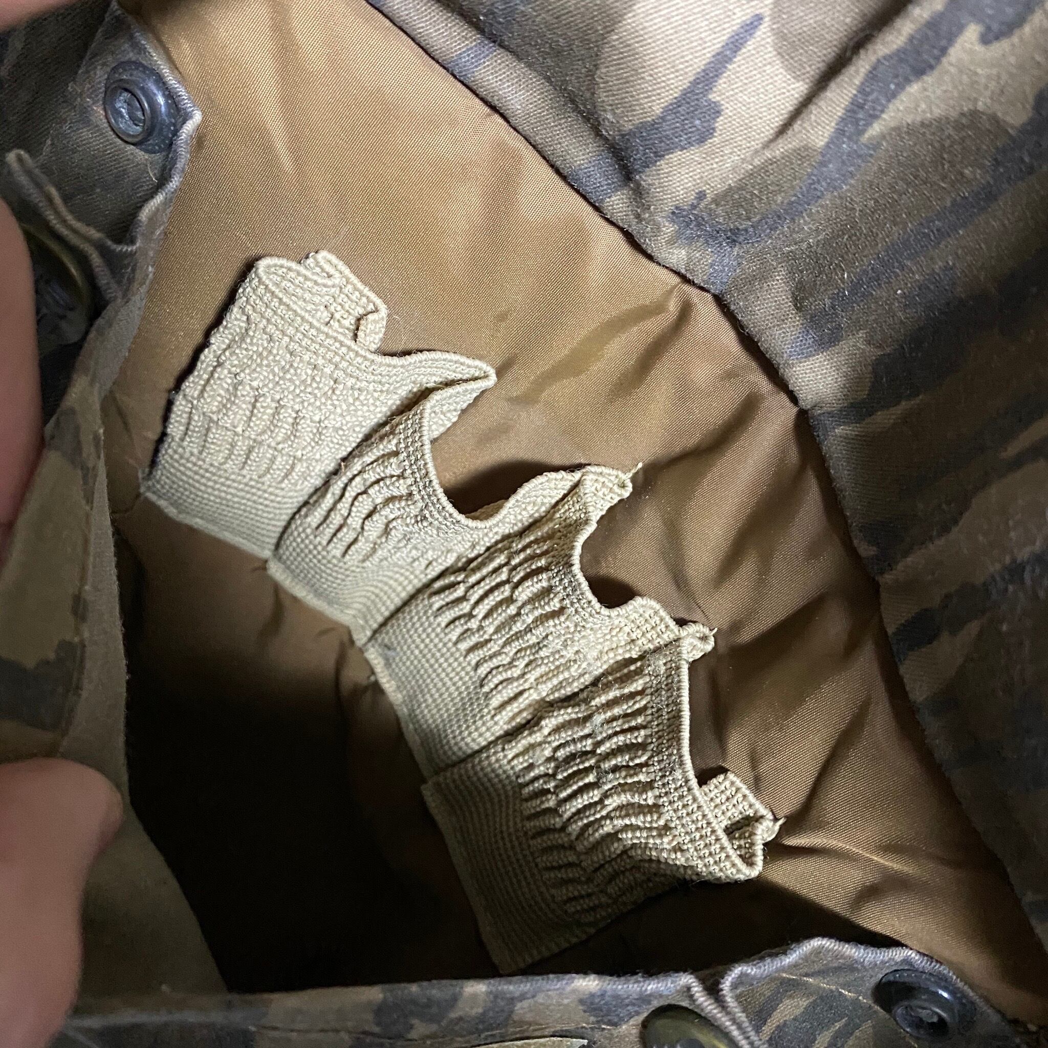 ナイロンでは無くハリのあるコットンポリ 少しオイルかコーティングが施されていて(恐らく)、固めで頑丈な生地となっています オイルドが少し落ちて燻んだ色味となっていて良いですね