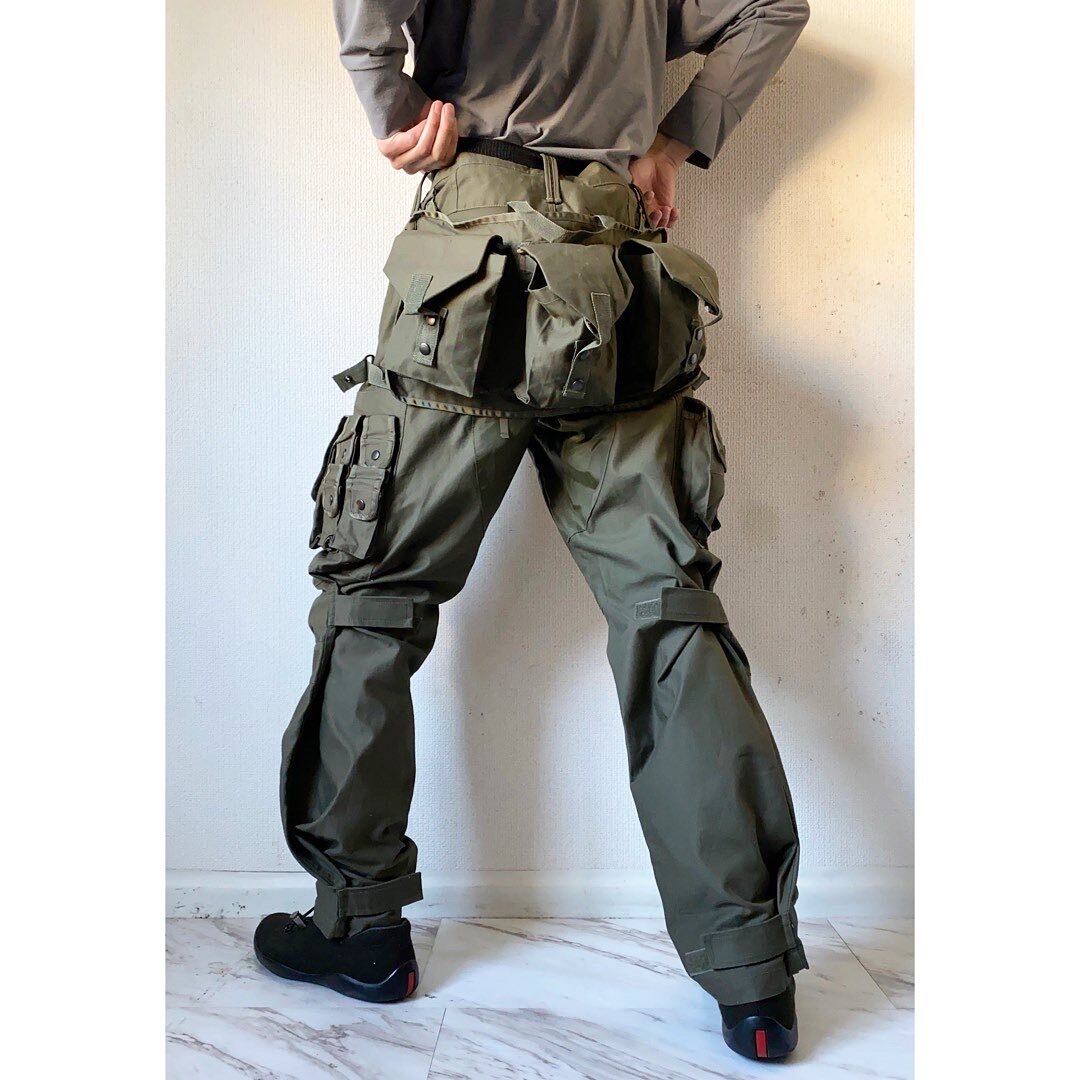 計17個のポケット 取り外し可能なビップバッグ m-44がサンプリング元でしょうか サイドにはアシンメトリーな立体マチ付きポケット多数 フロントにも立体ポケット 股下はナイロンへの切り替え ハンティングに良くある作りですね