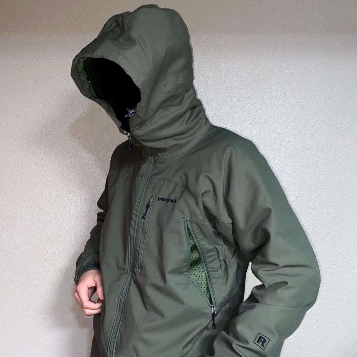 パタゴニア、マーズを彷彿とさせるアルファグリーン オリーブグリーンに少しコヨーテカラーを混ぜた様な色味 凸凹としたソフトシェルとジャージの間の様なナイロンポリエステルの素材感