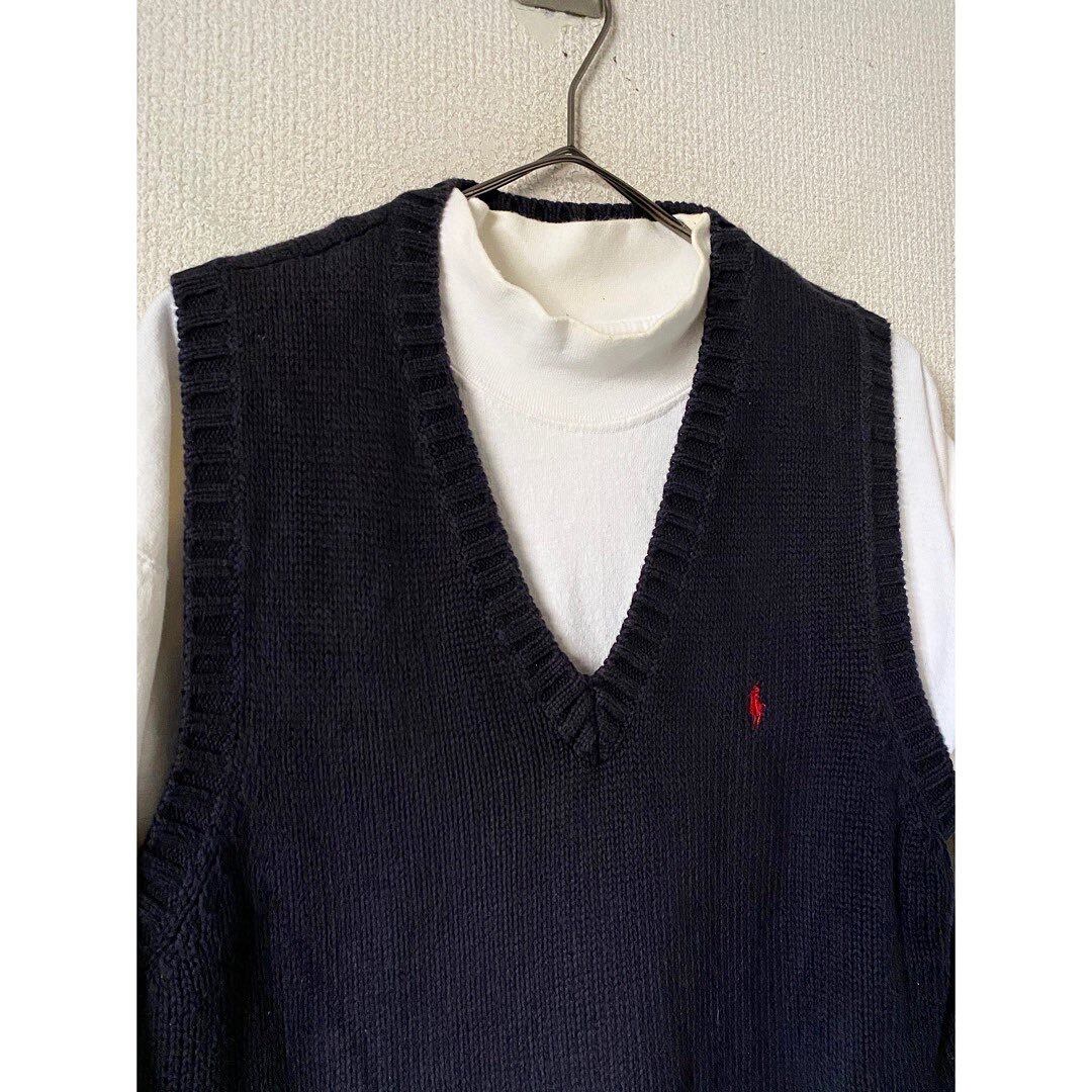 使いやすいネイビーカラーに赤の刺繍ロゴ 深めのvネック