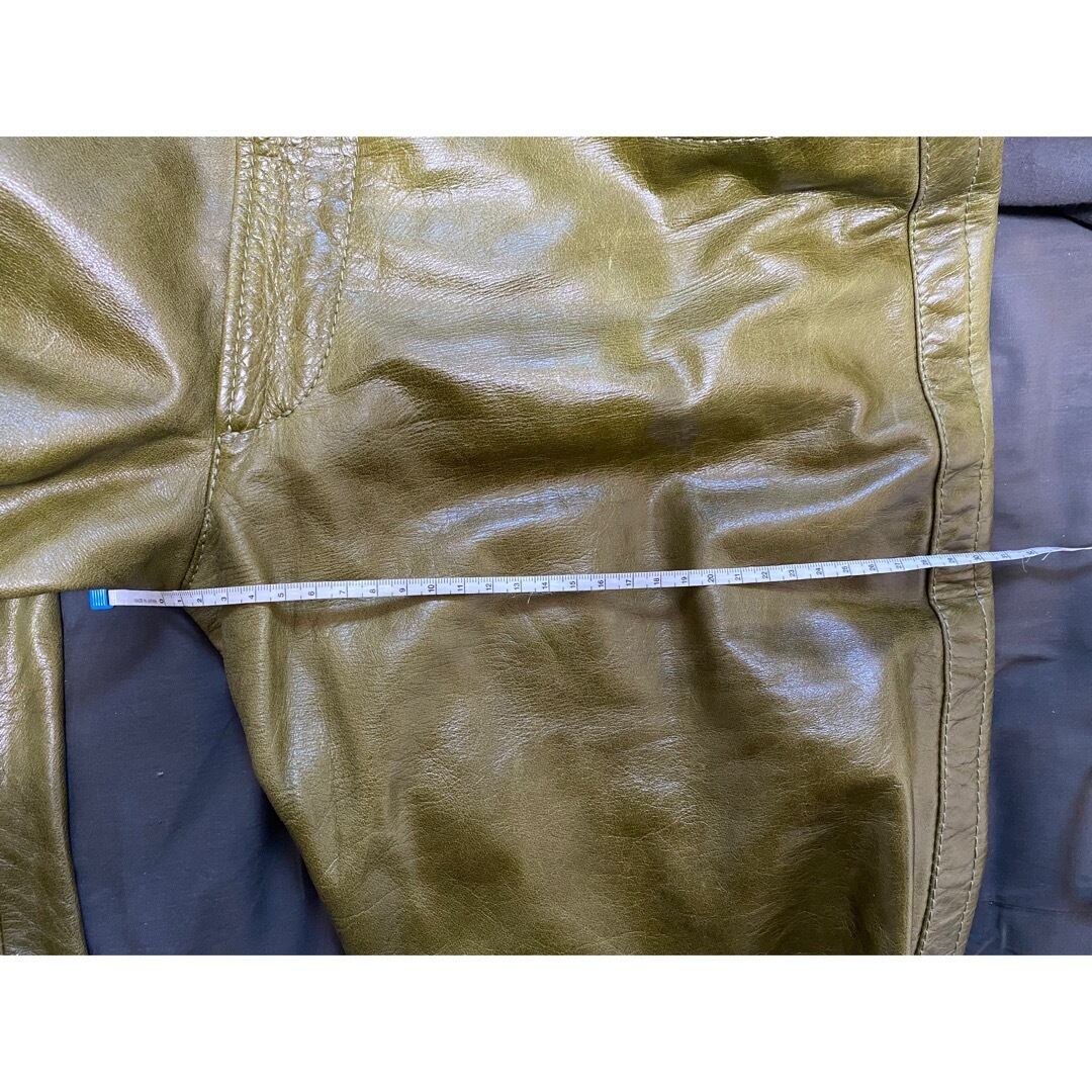 小さく元々のムラ染めによる色の違いなのが、小汚れか分かりかねますがももあたりにその様な物がございます 目立つ物ではなくレザーパンツのムラ染め特有の雰囲気として楽しめます 美品の内かと