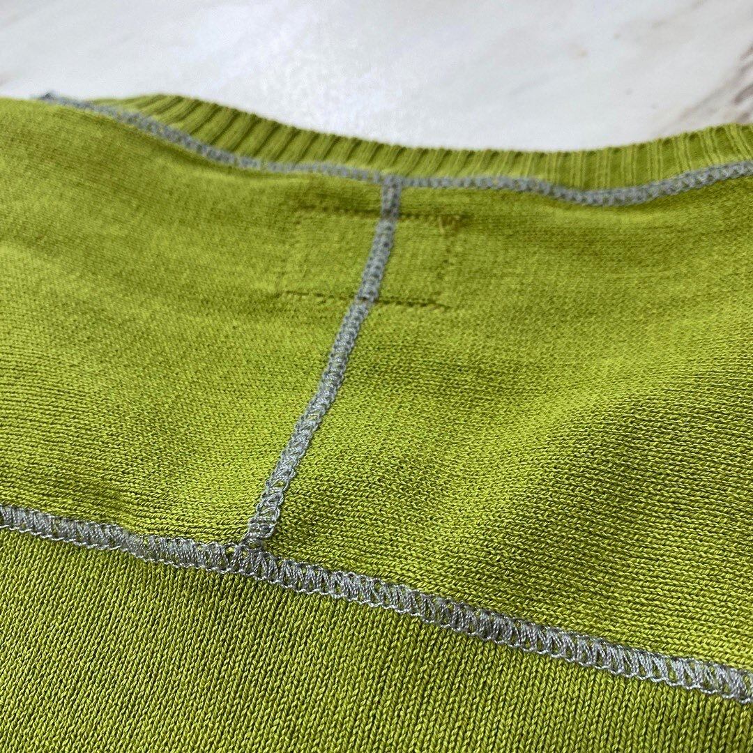 春らしい発色の良い黄緑色にグレーの糸を使った縫い目がよく映えます ラグランスリーブともまた違う変型ショルダー いずれにしても肩の落ち感が素晴らしい