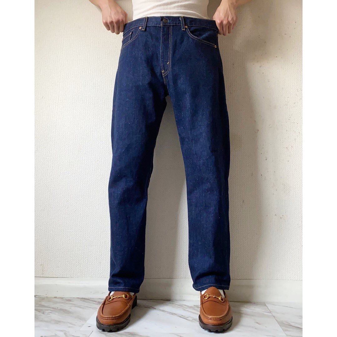 1ウォッシュ〜2ウォッシュ程度 濃紺で毛羽立ちが出る直前くらいの色残り 程良く太く履ける35インチ 34とレングスが長めだったのでこちらで丈直ししときました