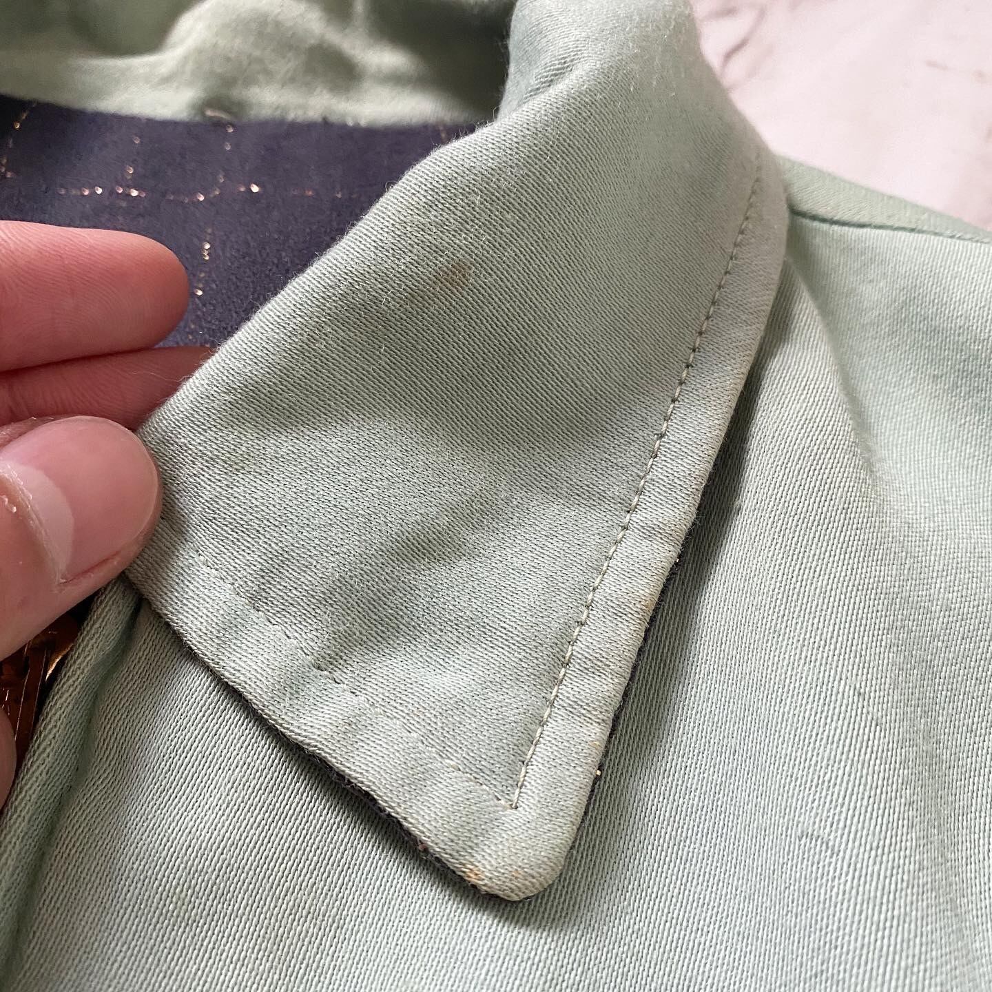 およそ70年前のギャバジャン A面はネイビー地に光沢強めの金ライン B面はS/Sには嬉しい涼しげなミントグリーンの単色 それぞれ袖や襟を折り返して着こなすとバイカラーになって面白いです