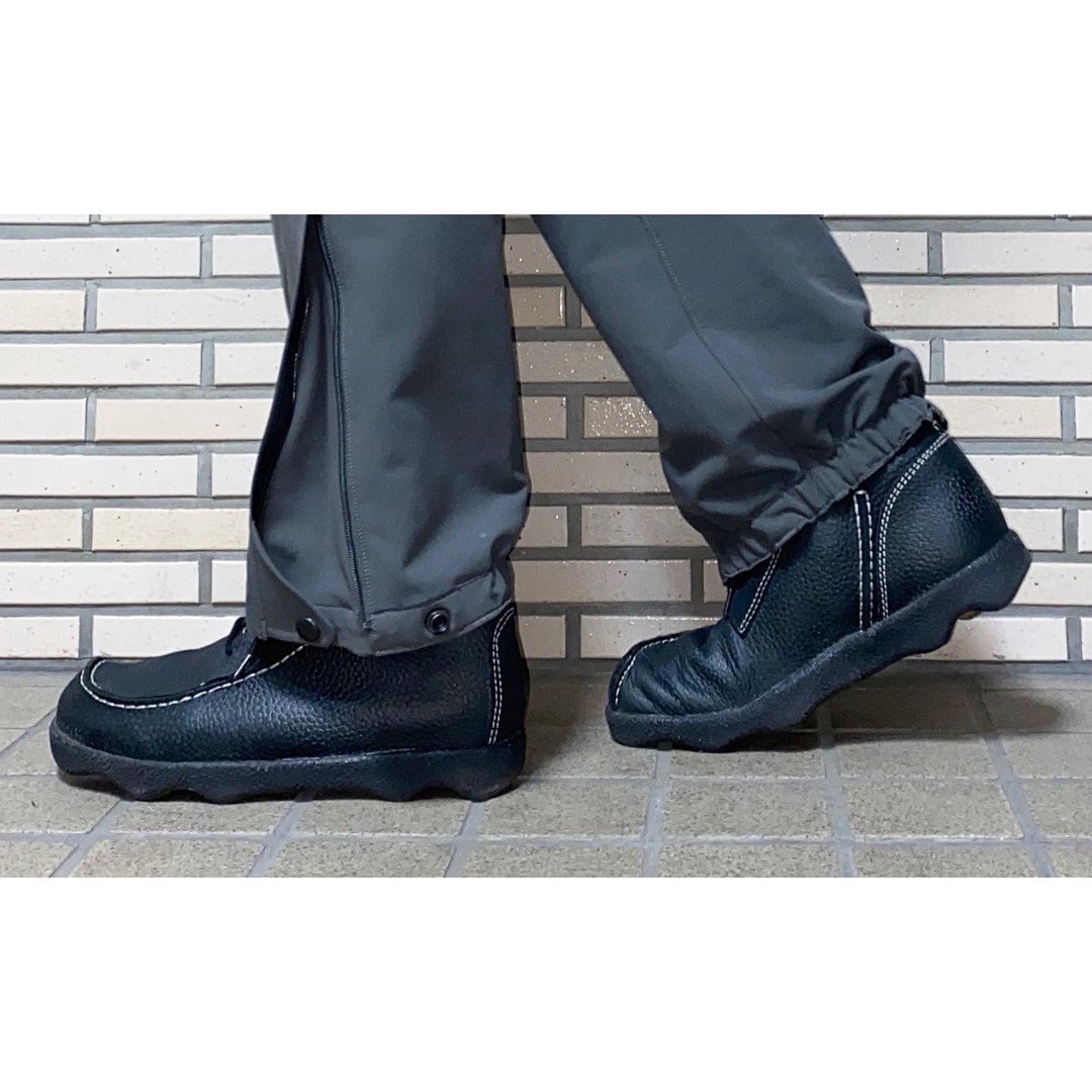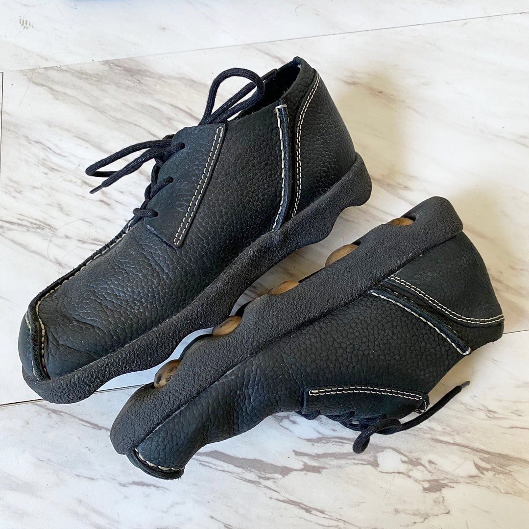 シボ強めのブラックレザーに白ステッチ サイドの革がそのままトゥを包む面白いデザイン 疲れ知らずの厚底ソール ベロのラバーロゴも良し