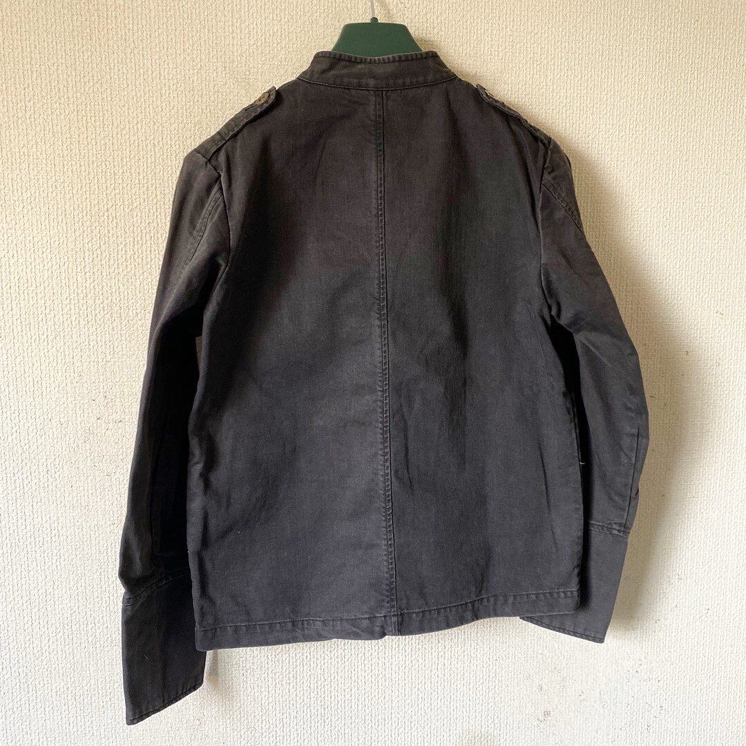 ナポレオンジャケット型のボタン配置 さらにフロントジップにサイドジップポケットを足した作り 袖口の3連ボタンも効いています