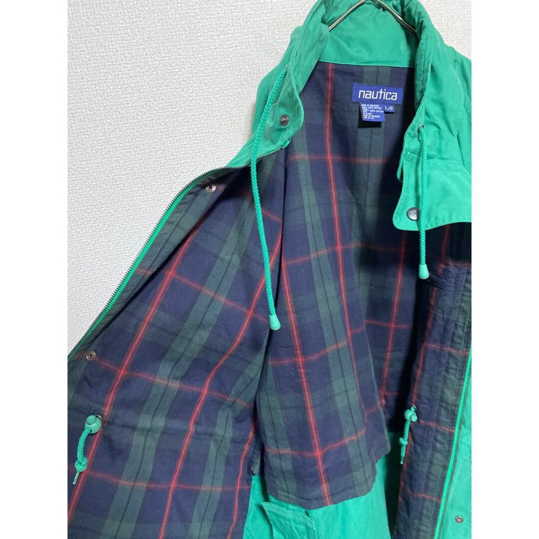 鮮やかな青みがかったグリーン 収納フード 中に絞りが付いているので大きめのシルエットに緩急を付けられます サイド裾にスナップ