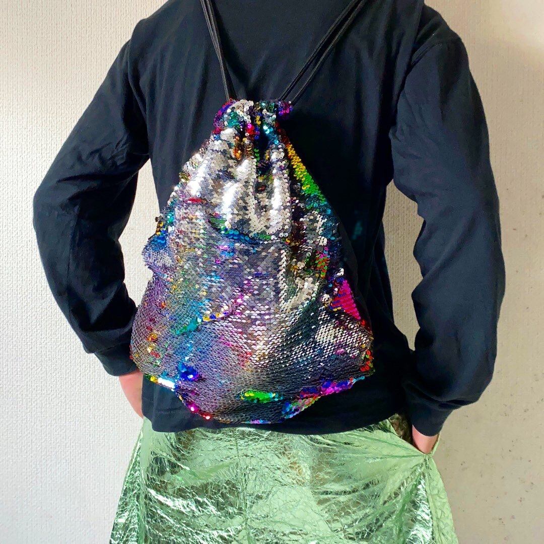 前面にスパンコールが付けられた巾着袋型のナップサック スパンコールの表、裏の鱗で色が変わっているので気分で向きを変えられます