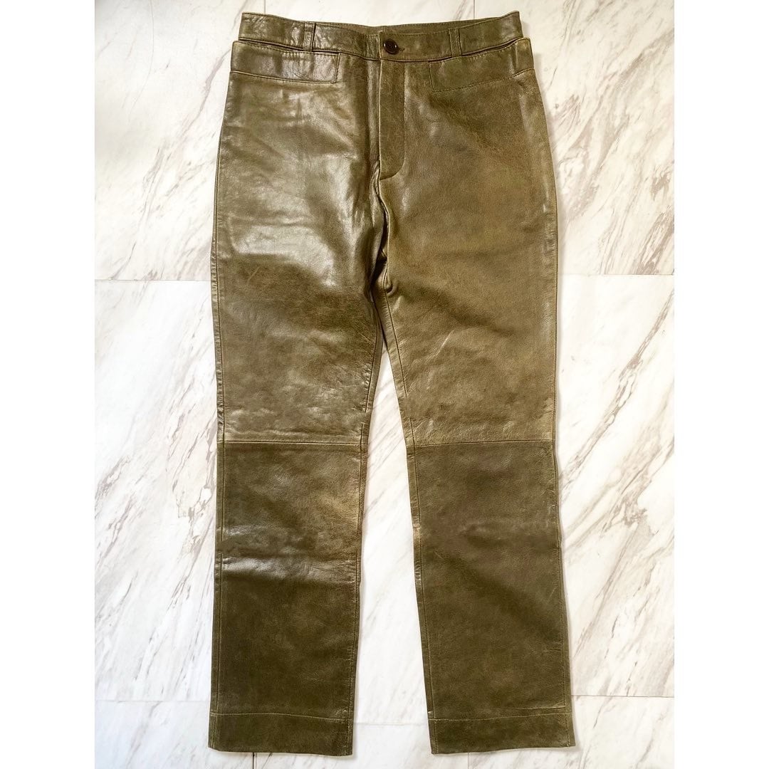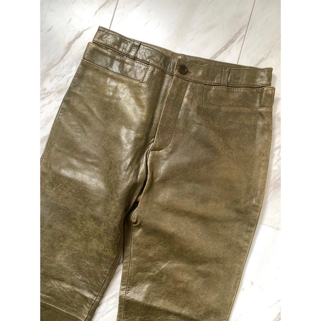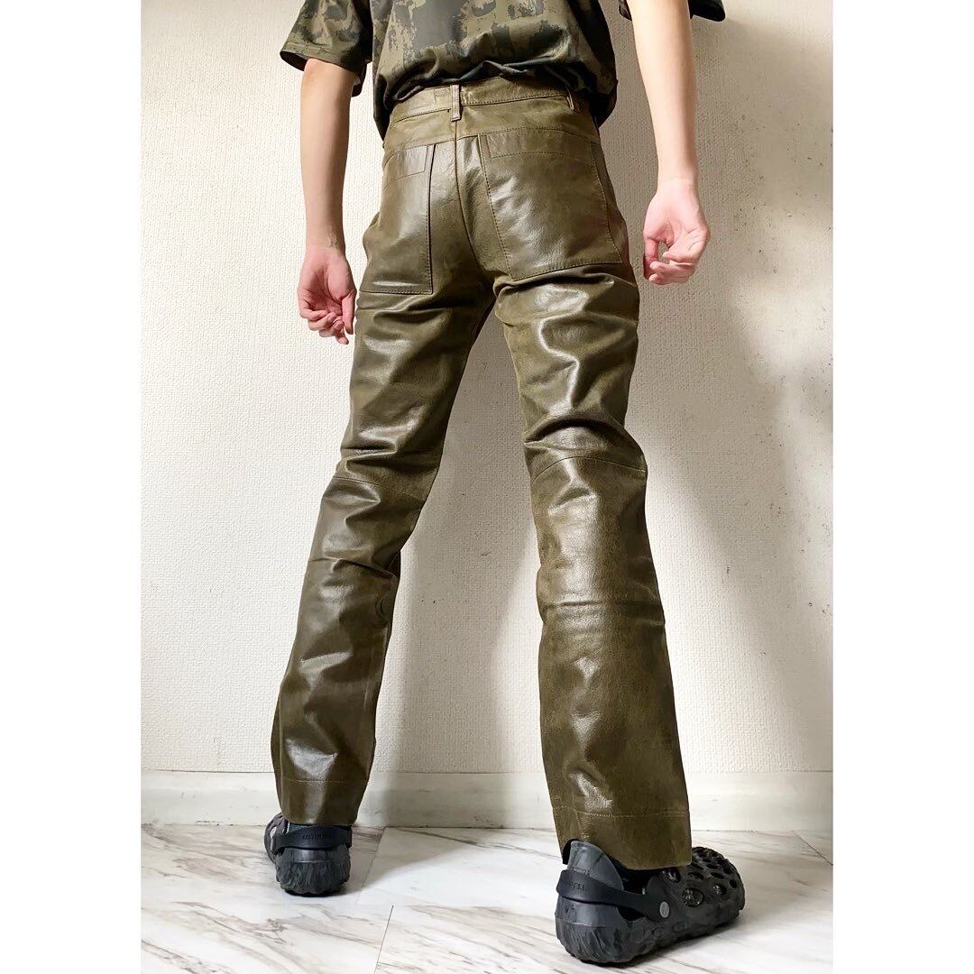 多数のルックに用いられたシーズンを象徴するボトム ムラ染めで濃淡のあるオリーブグリーンが良い表情 ラムレザーの中でも良い革質
