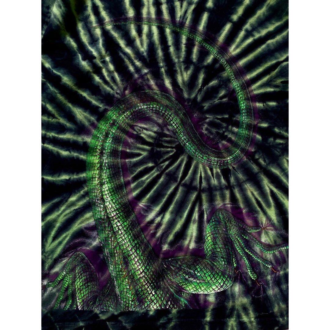 ドス黒いグリーンブラックのタイダイ染めとグリーンイグアナの美しさが相まって独特の雰囲気を醸し出します