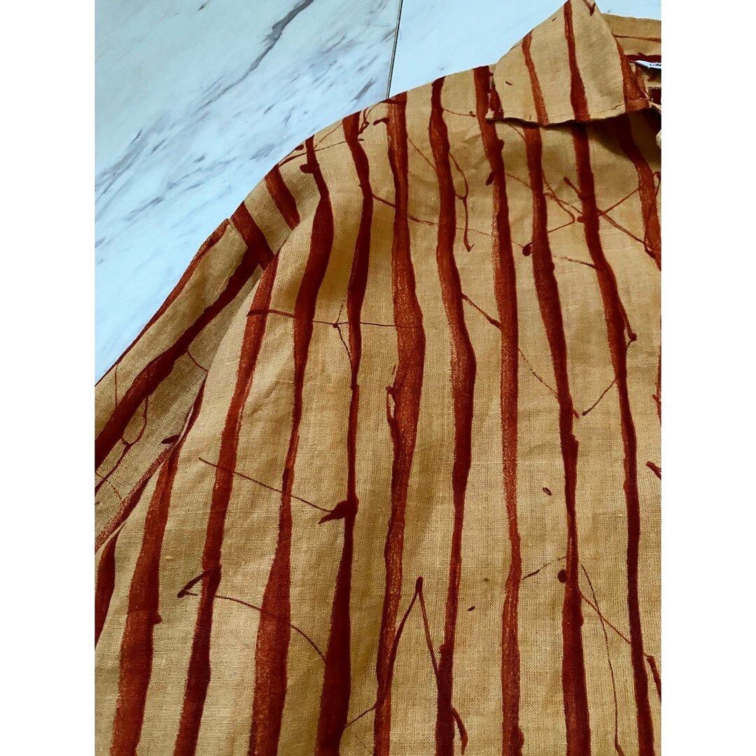 煉瓦色とオレンジの暖色系のストライプ 対して素材はリネン100%の涼しげな素材 筆で描いた様な特殊なストライプもシーピーカンパニーらしい