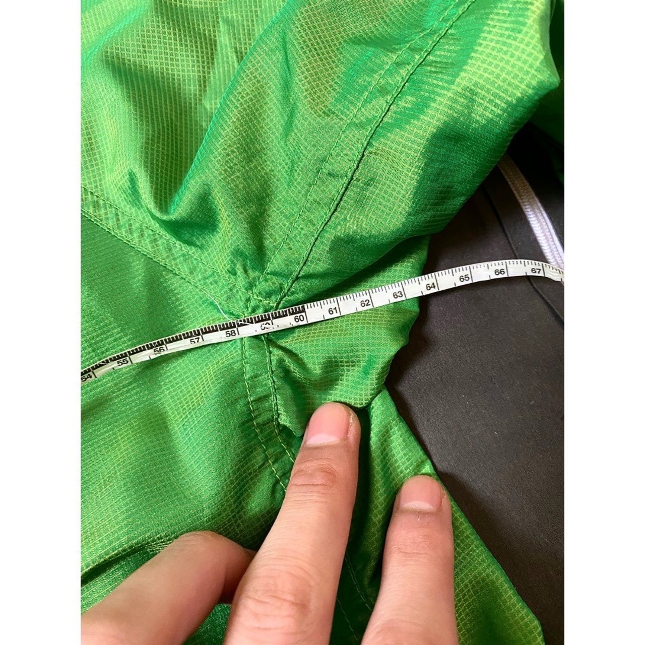 目立たない程ですが、フロントジップ横に変色?の様な物 自分自身は全く気にせずに着用していました 右アームに1本糸抜け