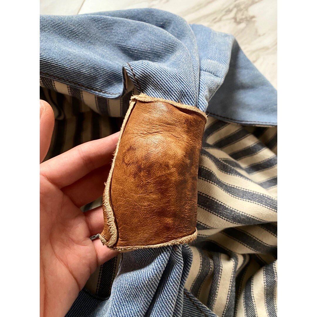 茄子紺色に日焼けしたヴィンテージのユーロワーク系の生地を解体後、再構築 レザー部分も風合いから昔の物を使っているかと