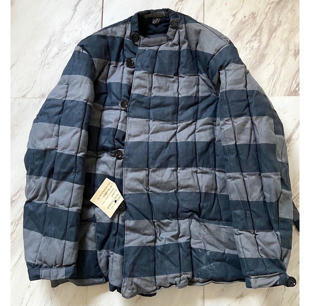 旧ソ連の囚人服 中綿パンパンのパデット仕様 墨黒×グレーのピッチの太いボーダー 少し真ん中からずれたフラップ式ボタン きちんとポケットも付いています ウエスト部分に紐が付いているのでキュッと絞ってシルエットに緩急をつけられます