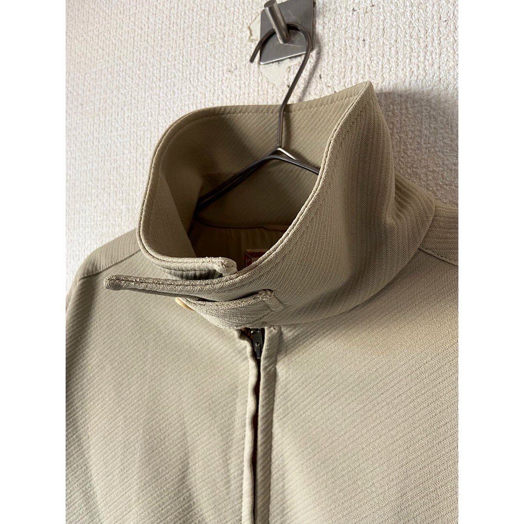 バイヤス状に線の入ったもちっとした肉厚ウール ベージュ系の使いやすい色味 この年代特有の極端に尖った襟 チンストラップ付きなので襟を立てられます
