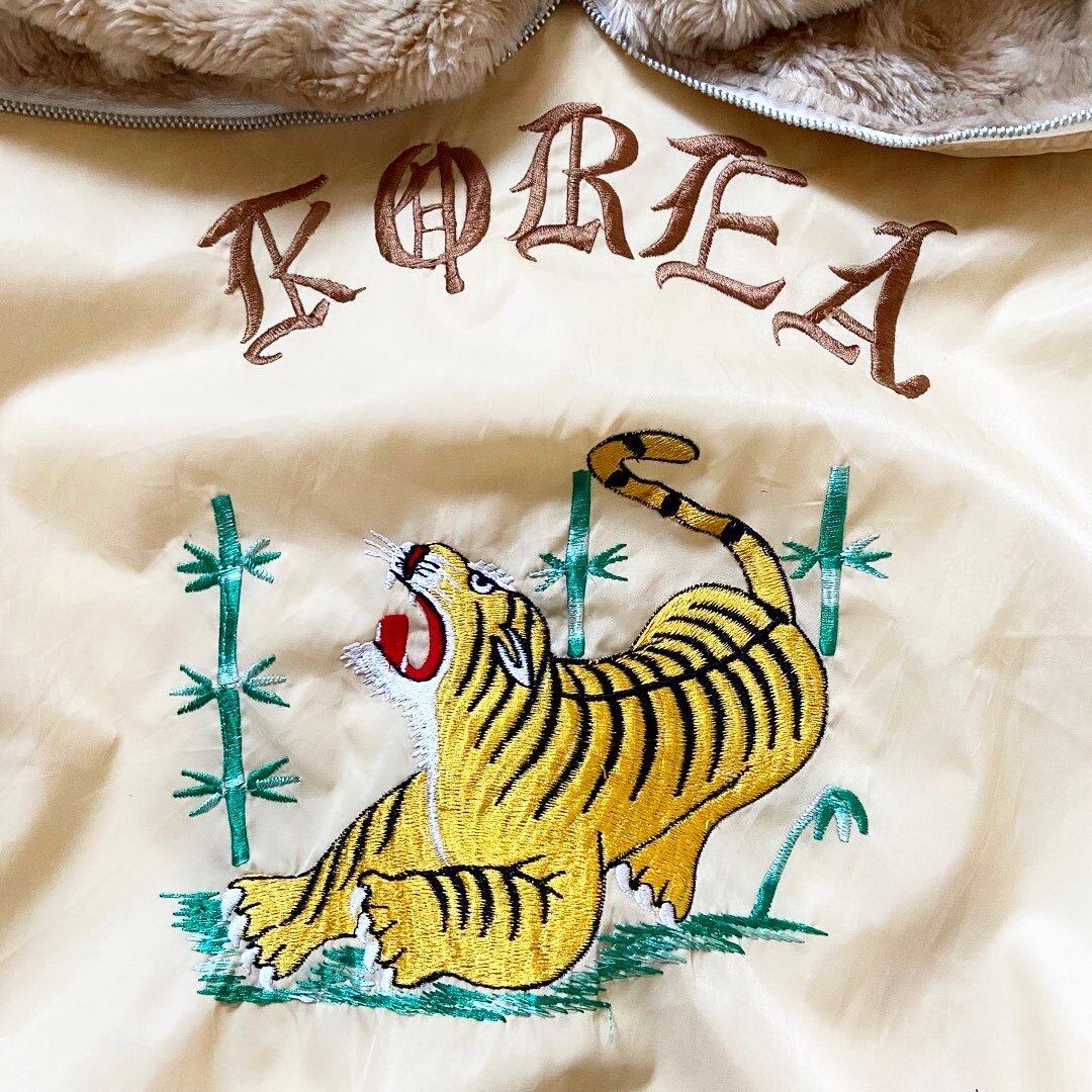 優しいレモンイエローのナイロンシェル バックには虎と"korea"刺繍 胸にも刺繍