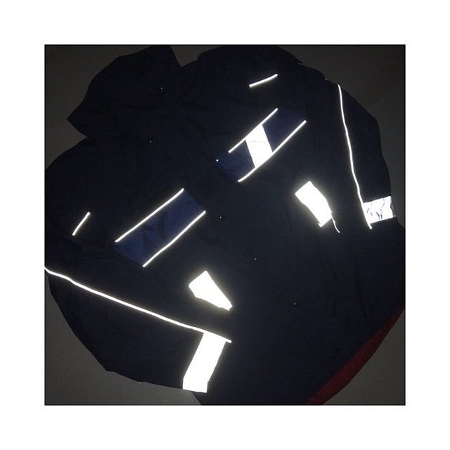 ハリのあるハードナイロンシェル 主張強めのリフレクター真っ暗な闇での作業ですぐに何処にいるか分かるように付けられたもの