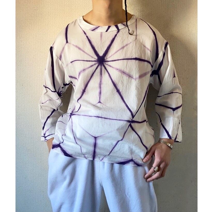 ホワイト×パープルの計算しつくされたスパイダーウェブの様なタイダイ染め 開いたネック部分