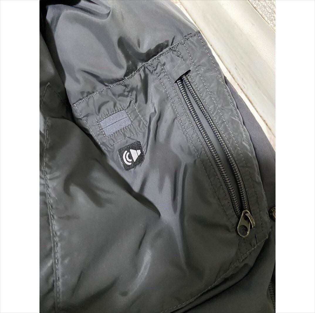 ダークグレーに少し小豆色を足した様な色味 背中と胸に刺繍ロゴ 両胸ポケット 左ポケットはジップ式で開けると中にもベルクロポケットが付いています 裾にもポケット アームにジップシュガーポケット