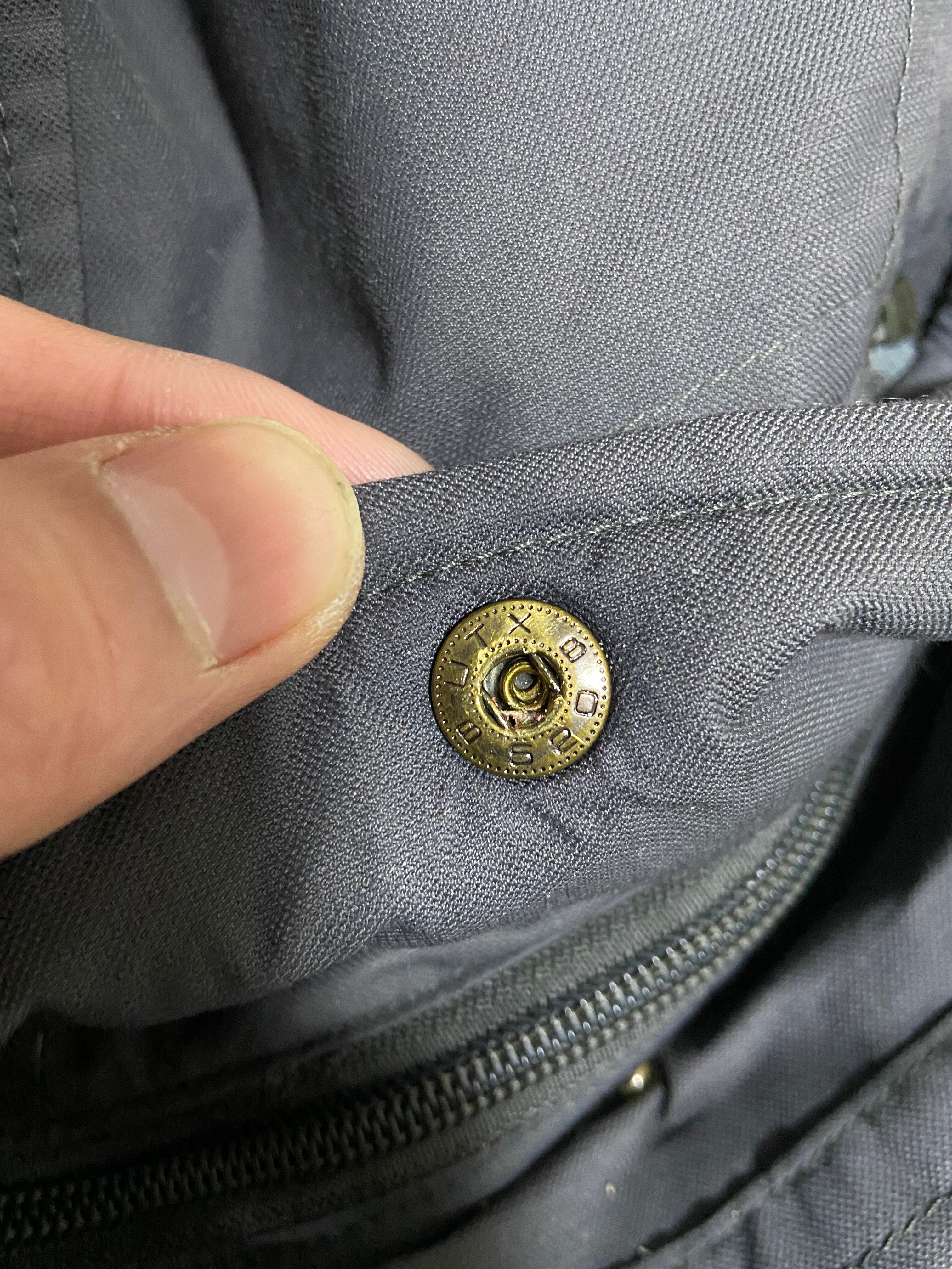 右肩にかなり小さな汚れ 石鹸ブラシで落とせる程度です 上から4つ目のスナップが機能しません ジップ+スナップにので全く問題ありません スナップ受けの変形が原因だと思われますので、もしかしたらピンセットなどで直せるかもしれません