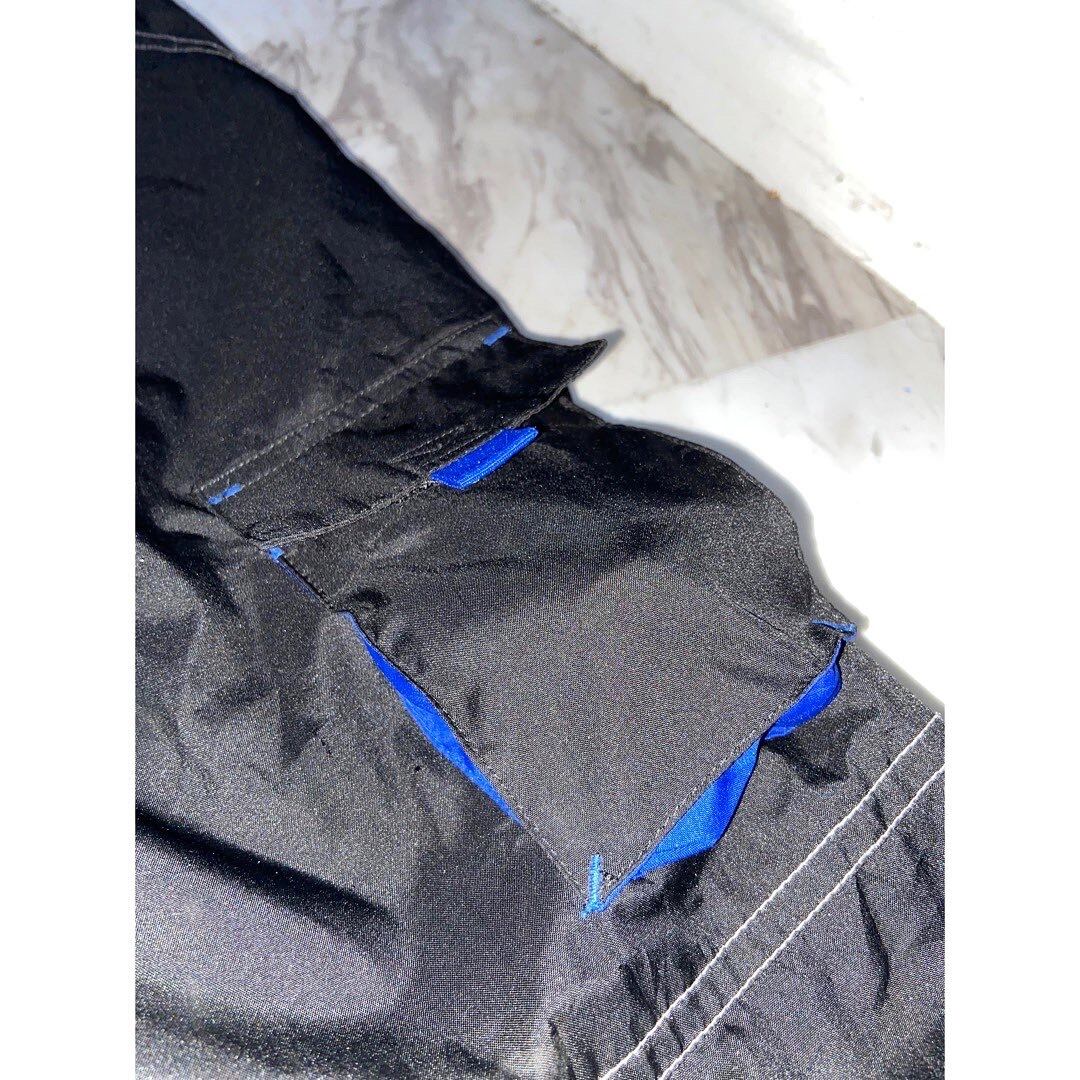 ブルー×ブラックの高配色 サイドポケット他に左足にベルクロポケット 裾ジップを開くと裏地のブルーがチラリと見えて良い感じ