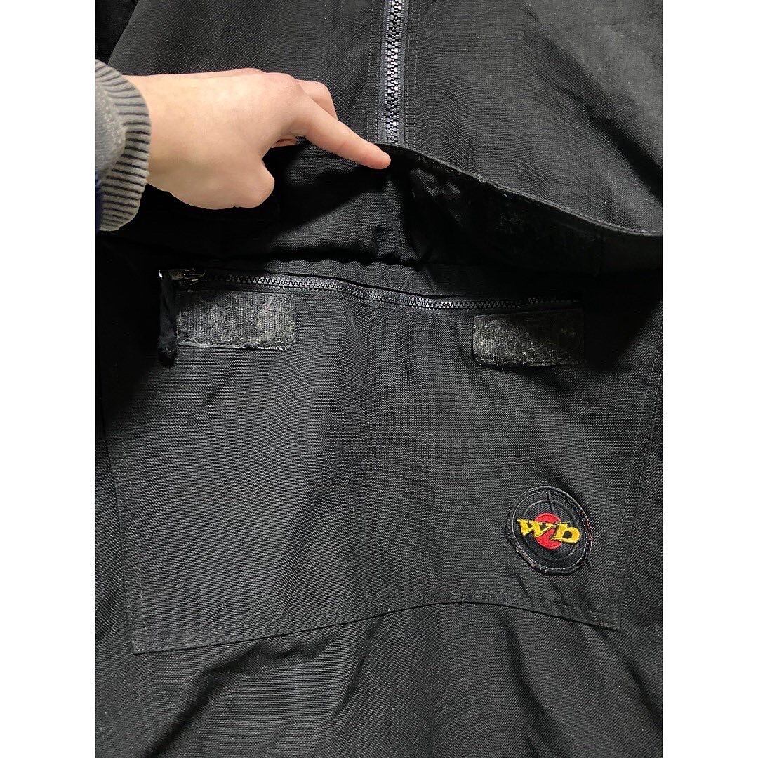 ジップ+ベルクロの大きなドラえもんポケット 刺繍ロゴ入り かなり厚手のハードナイロンシェル 前着丈と後ろ着丈の違うフィッシュテール バック裾に同系色のステッカー 襟裏はフリース仕様