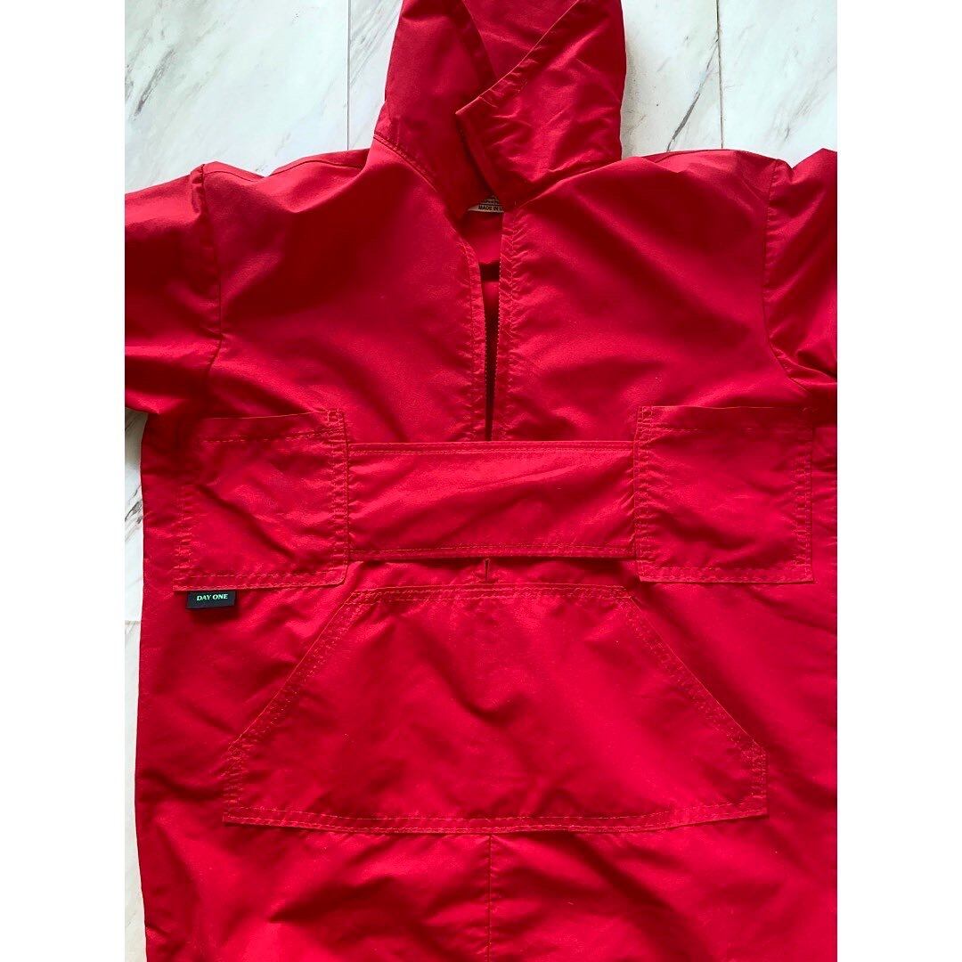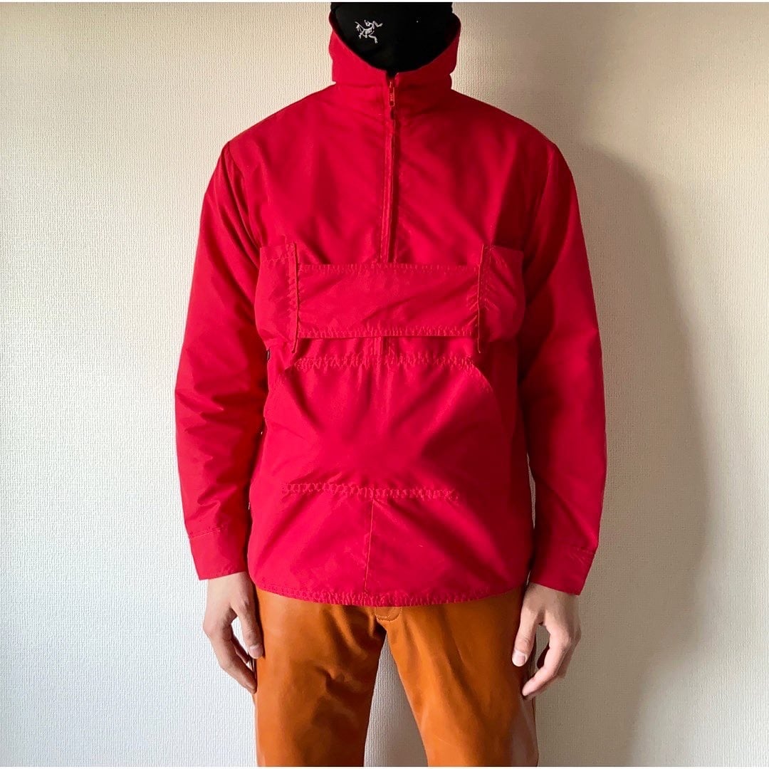パキッとしたナイロンシェル 発色の良いレッド 胸ポケット間に謎の橋が掛かる面白い仕様 その下に交差する様にジップ 裾にはドラえもんポケット プルオーバー式 オレンジのボタンも良し