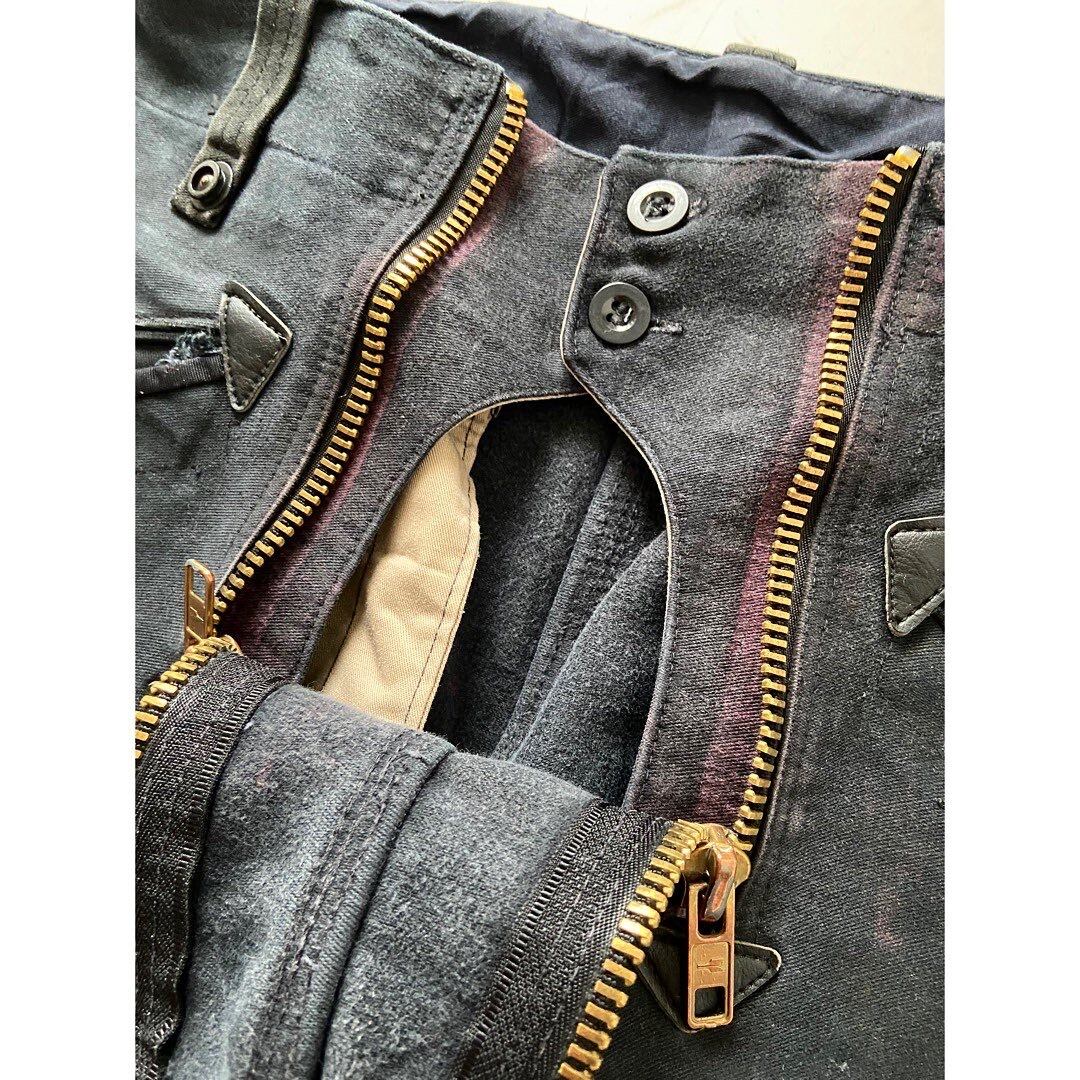 急所を傷つけないためのフロントダブルジップ、ダック地のニーパッドにはデニム生地があしらわれています 所々のレザー使いも良し 理にかなった造りでデザインの面白さもあるアイテムです