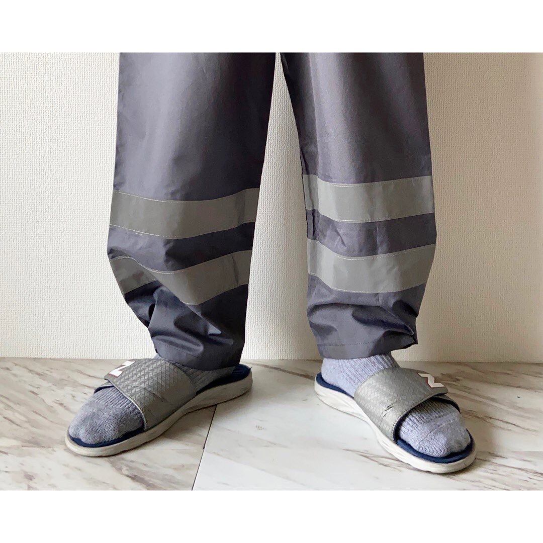 少しセージグリーンがかった濃いめのグレー 無機質で冷たい良い色味 裾にはリフレクター2ライン オーバーパンツ特有の夏には涼しげなスルーポケット