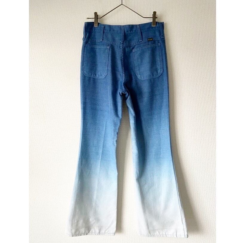 かなり強めのフレア加減 こちらも上から下に色が薄くなって行くフェード染め 少し太めなので腿がパツパツになる事もなく程よいシルエットとなっています