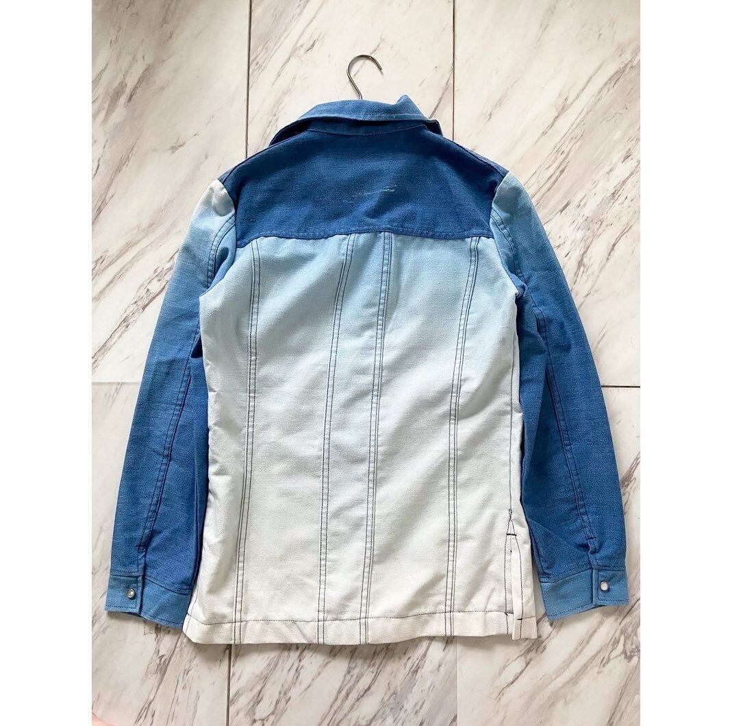 ザ・ヒッピーアイテム 鮮やかなフェードしたインディゴ 濃紺、ライトブルー、ホワイトと色の濃淡が芸術的 スナップボタンに70年代らしい少しシェイプしたウエスト 尖った襟も良し