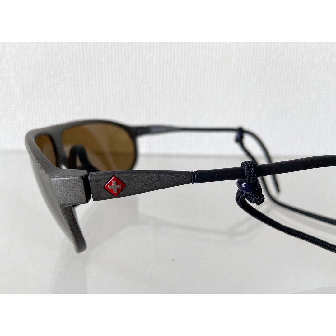 サイドにスイスの国旗 メガネ掛け用の紐が付いているので首から足らせます