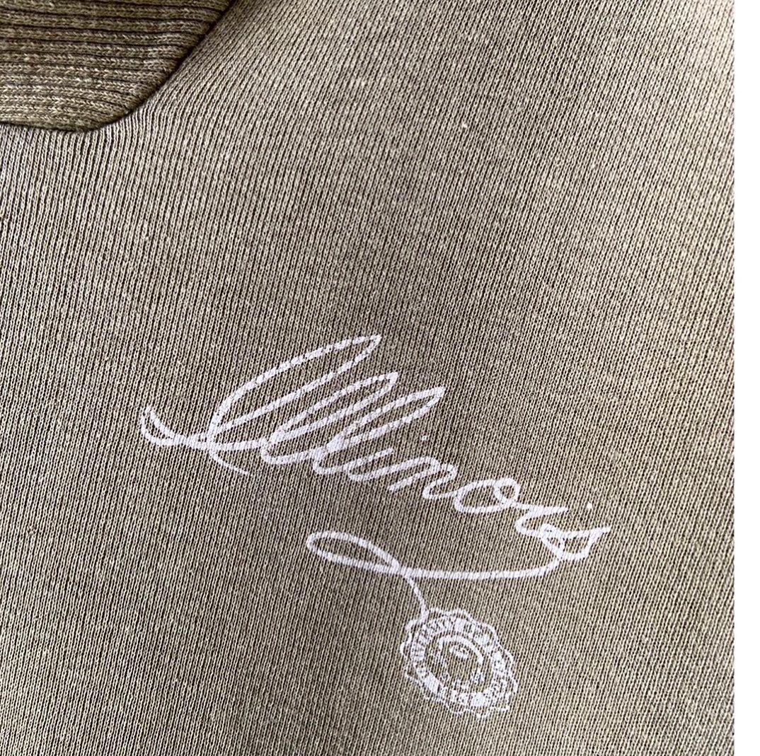 くたっとした日焼けで風合いの出たオリーブグリーン 筆記体のイリノイロゴも良し
