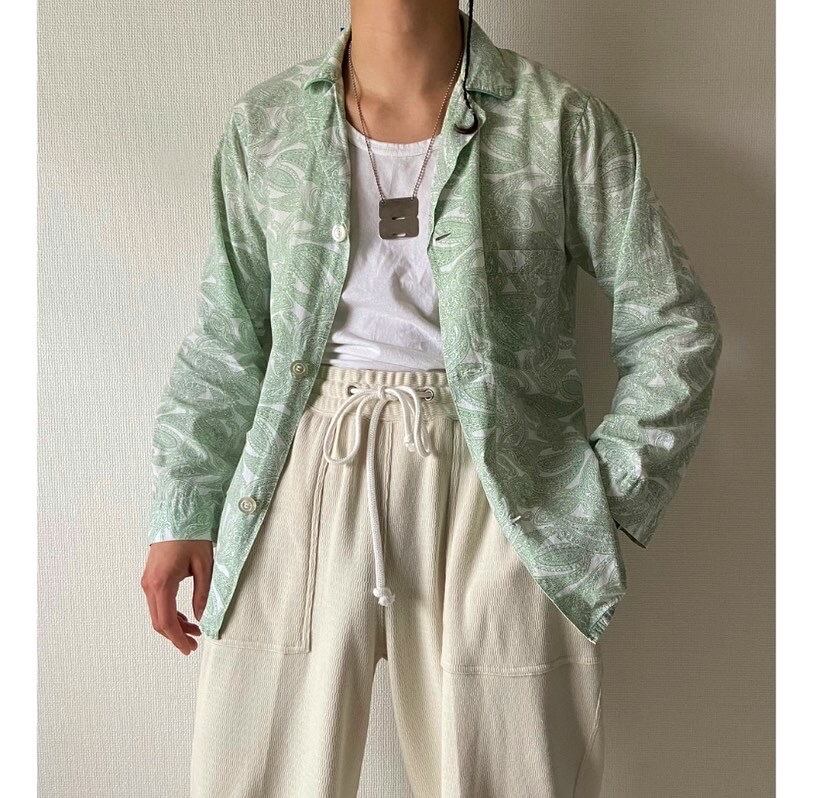 vintage 60s 〜 70s van heusen green paisley open collar sleeping shirt