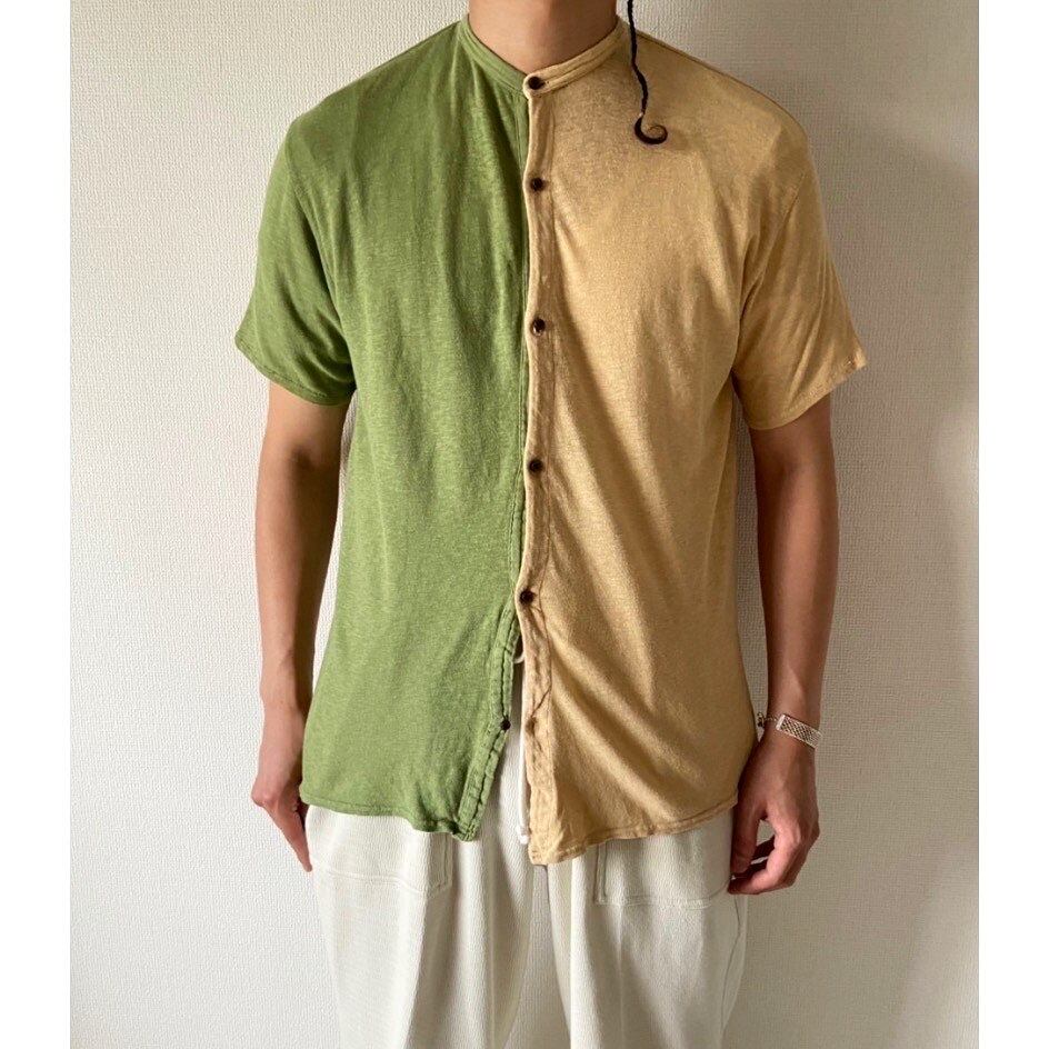 斬新な切り替え ライトグリーン、抹茶系×イエロー強めのベージュ 前後ろで小ぶりの6ボタン ノーカラー