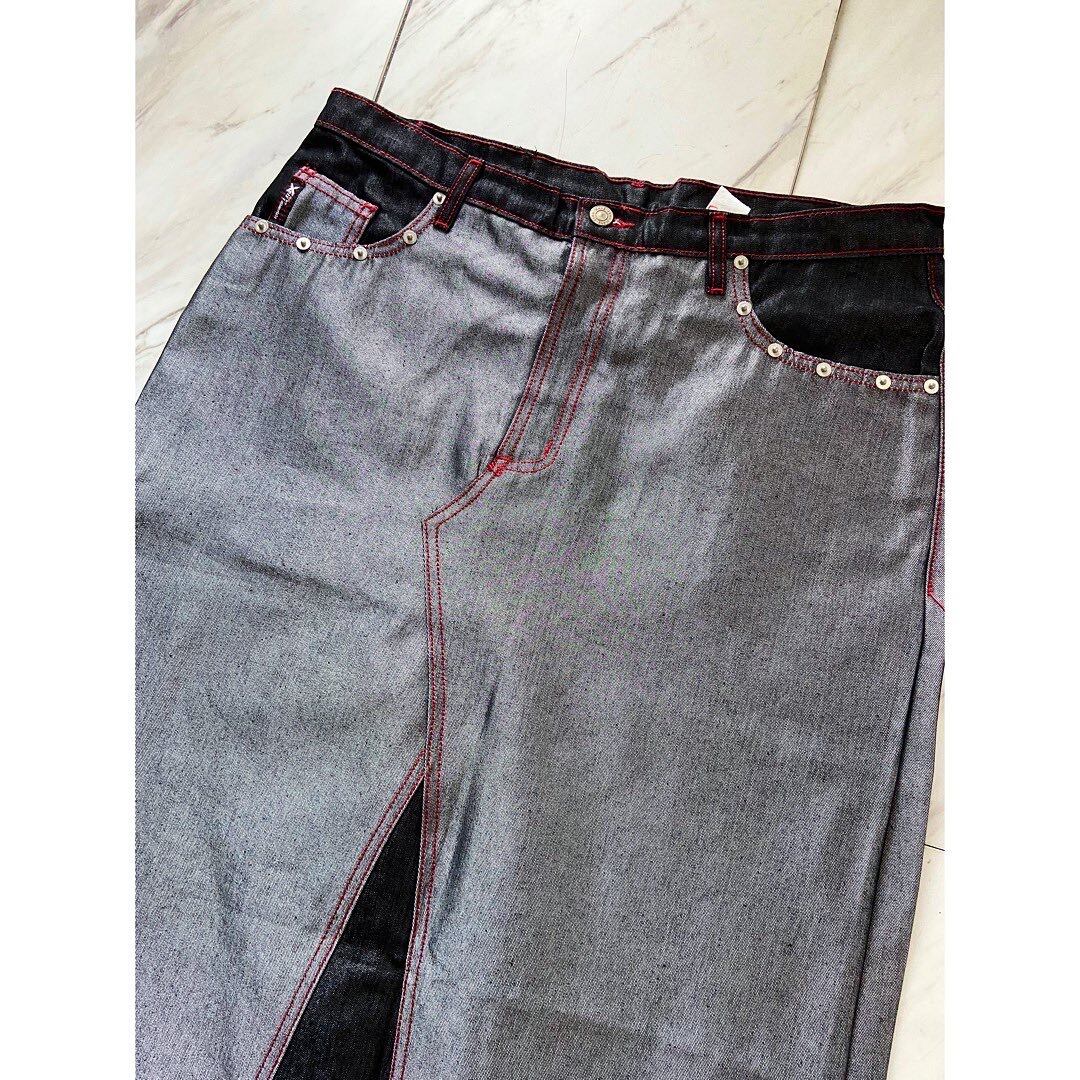 おそらくデッドストック、ノーウォッシュ ハリとのあるリジッドデニム シルバーとブラックの光沢のあるコットンレーヨン 赤のステッチが映えます