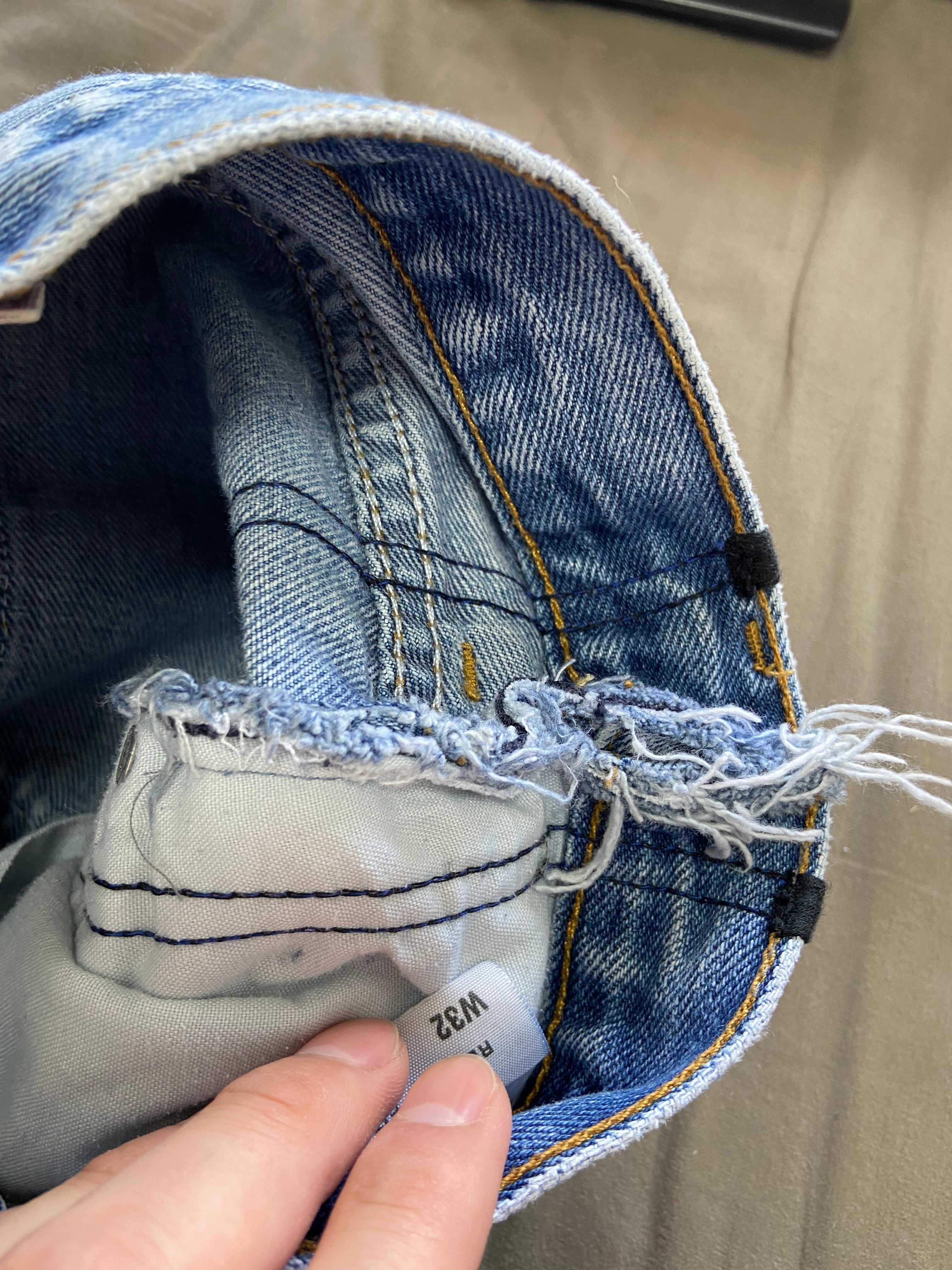 右ポケット下に汚れあり 両ポケットリベットあたりに小さな貫通部分(構造上そうすることしか出来なかったのかと) サイドラインにとても小さなほつれ部分 バック裾あたりにとても薄いほぼ分からない程度の薄いシミ