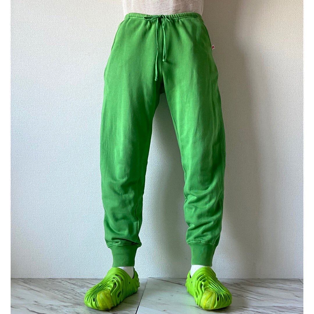 ライトグリーン、ウグイス色系の爽やかな色味 ふわっとしたコットンスウェット地 ジョガーパンツ型の裾はリブ仕様 ウエストは紐+ゴムのイージーパンツ仕様 膝裏にシーム きちんとロゴタブが付いたポケ付き