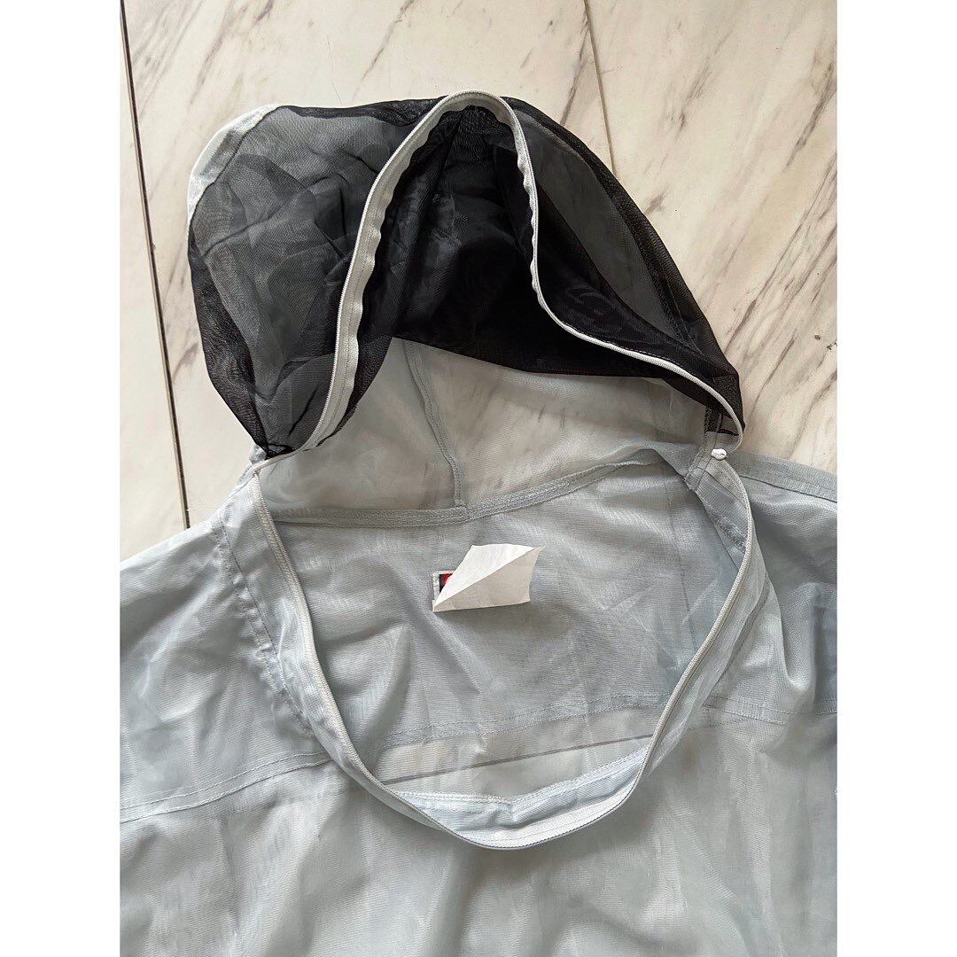 グレーと水色を混ぜた様なアッシュグレー フード部分前面はブラックの切り替え ジップで開け閉め出来ます ガバッと被れるオーバーサイズ