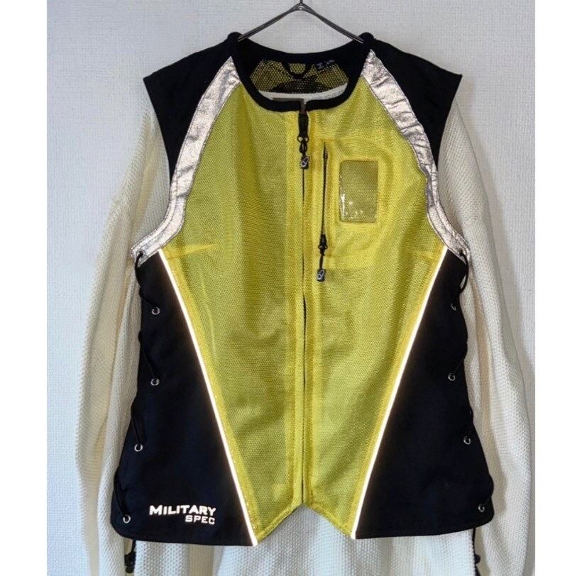 イエローメッシュ×ブラックハードポリエステルの切り替え 真ん中にはいるリフレクターテープ、パイピングが近未来的でとても良い バックはチェックリフレクター