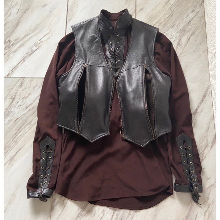 詳細不明のレイヤードセット ブラックに近い焦茶色の十分に鞣された柔らかいレザーベスト フロントにかなり長さを取った巨大ポケット バック裾の紐でで身幅を調整できます 裏地はサーモンピンクの様なサテン織生地